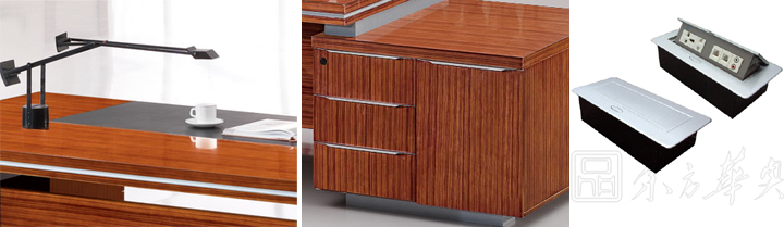 ※ 班台的皮革写字垫,侧柜细节图,以及线盒展示,此款班台可以选择如图的手动线盒、电动线盒、以及毛刷翻盖线盒,适合你不同的办公需要,内部可配置动功能三插电源孔、网络接口、耳机音频接口、话筒接口、VGA接口,也可根据客户实际需要选择和定做。