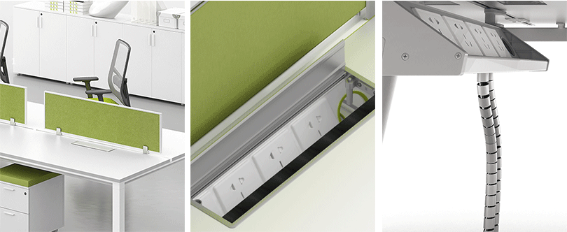 | 1、钢制脚架,实用高端大气; | 2、整齐划一、人性方便的桌面铝合金过线系统。 |