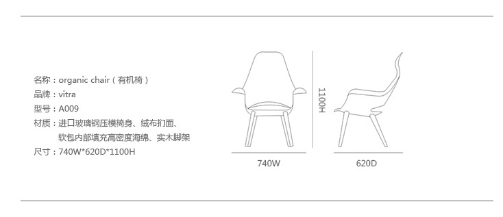 出自美国设计大师Charles Eames和芬兰设计师Eero Saarinen的作品,Organic Chair的诞生,是源自于1940年,纽约MoMa当代艺术馆所举办的有机有机设计竞赛。但是由于其独特的椅身曲线,及当时产量技术不足。Organic Chair一直到了1950年,才得以大量生产。Organic Chair是一张舒适的阅读椅,柔软的乘坐质感,贴心的扶手收边,加上榉木打造的椅脚造型,让他格外的具有收藏价值,在茶几边,书房中,搭配上优美的Organic Chair,悠然自得的午后时光,舒心惬意