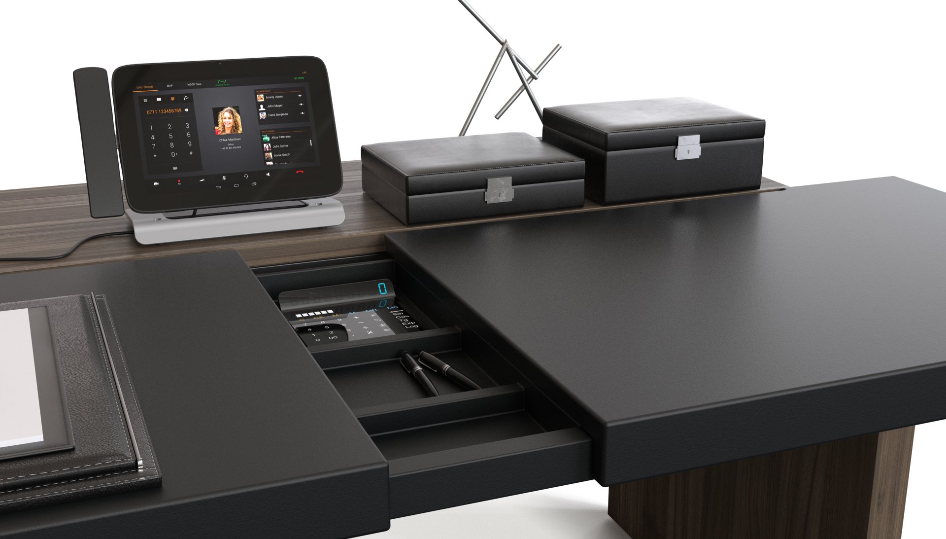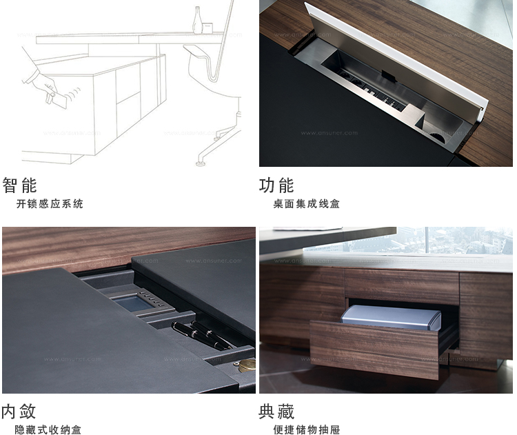 这是EOOS的新总部和会议项目设计团队对该产品强大的美学诉求,比例和维度在优雅的材料的相互作用下给人深刻的印象。在几何基础上,材料的拼贴形成了它的气场。海洋胡桃木饰面可以给你和你的客人带来一种很好的体验;扶手处采用精美的皮革覆盖。由Corian制成的白色方块盖住了集成线盒,看不见的触点是打开的关键。每个设备的连接器都在方块之下,所有的电缆都隐藏在侧板和桌子上,衔接到各种设备。在工作台表面的旁边,一个隐藏的抽屉,里面可以收纳你日常所需的小物件。