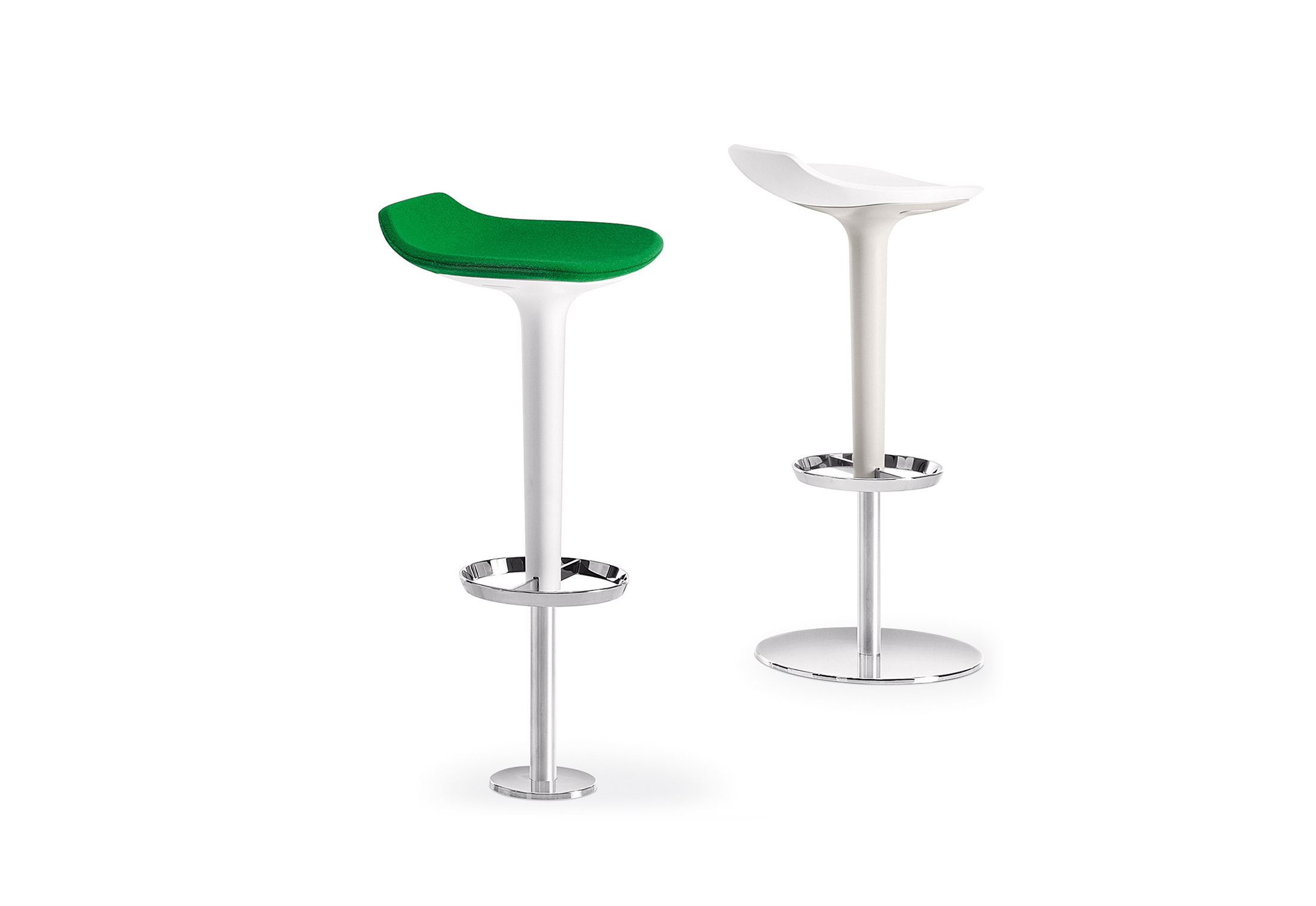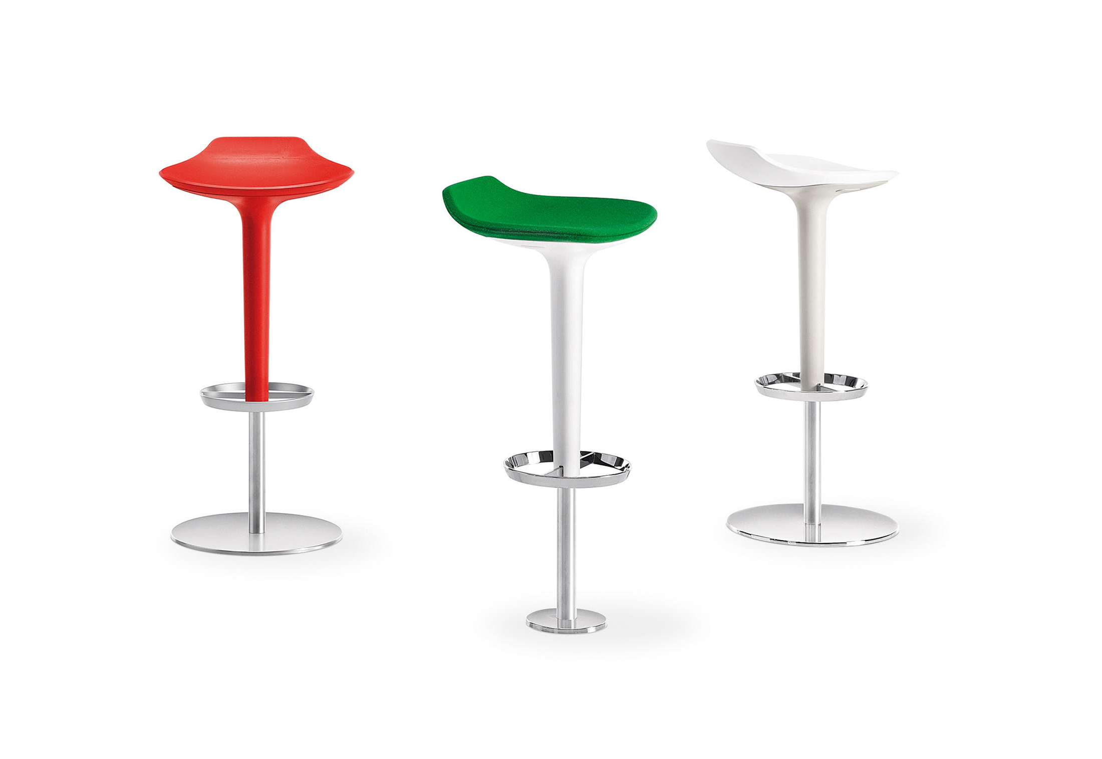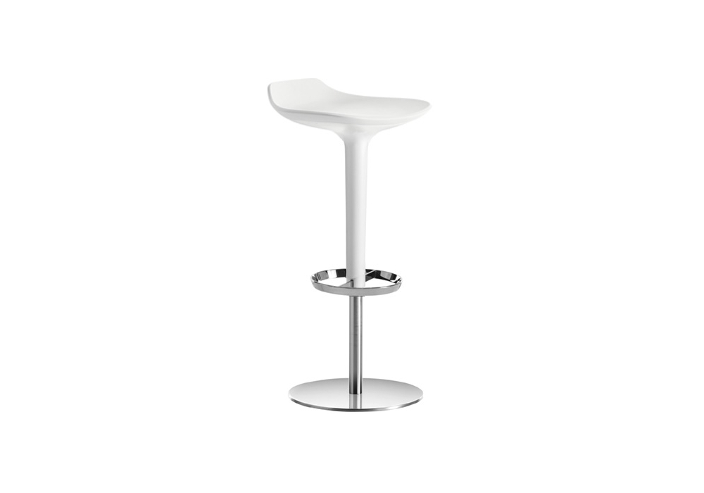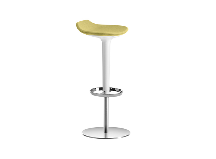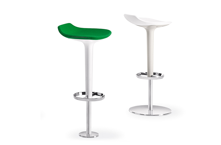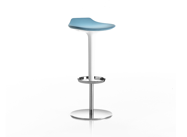 Babar凳子采用符合人体工程学的聚氨酯座椅制成,有多种颜色和双色组合。 软垫版本,座椅覆盖面料,皮革,人造皮革或客户自己的面料,配有靠背。 底座采用不锈钢制成,带有拉丝或镀铬表面,有固定,地板固定和可定制高度(65至77厘米)或高度可调的版本