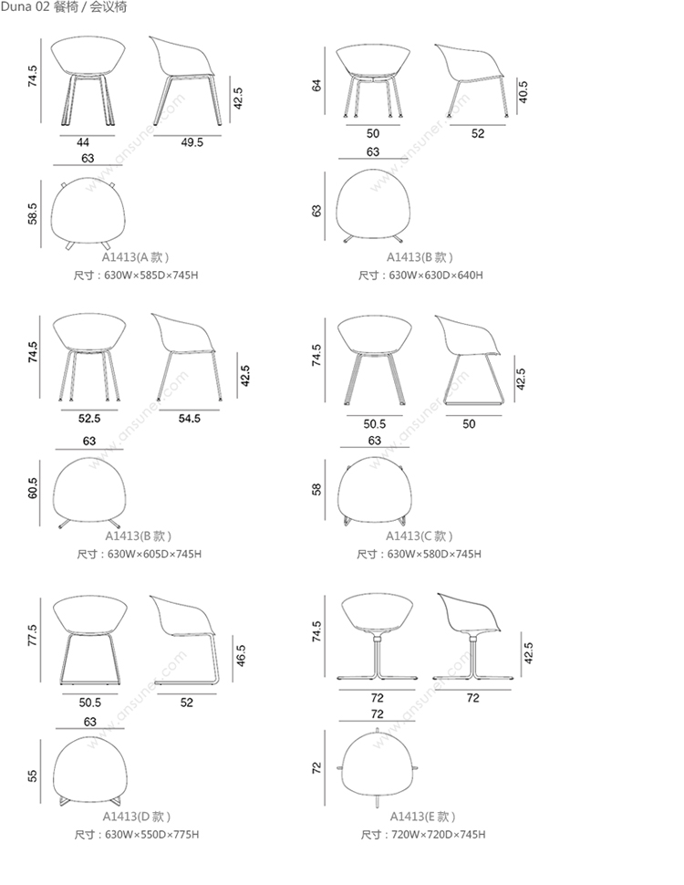 Duna 02 餐椅/会议椅 系列尺寸/示意图
