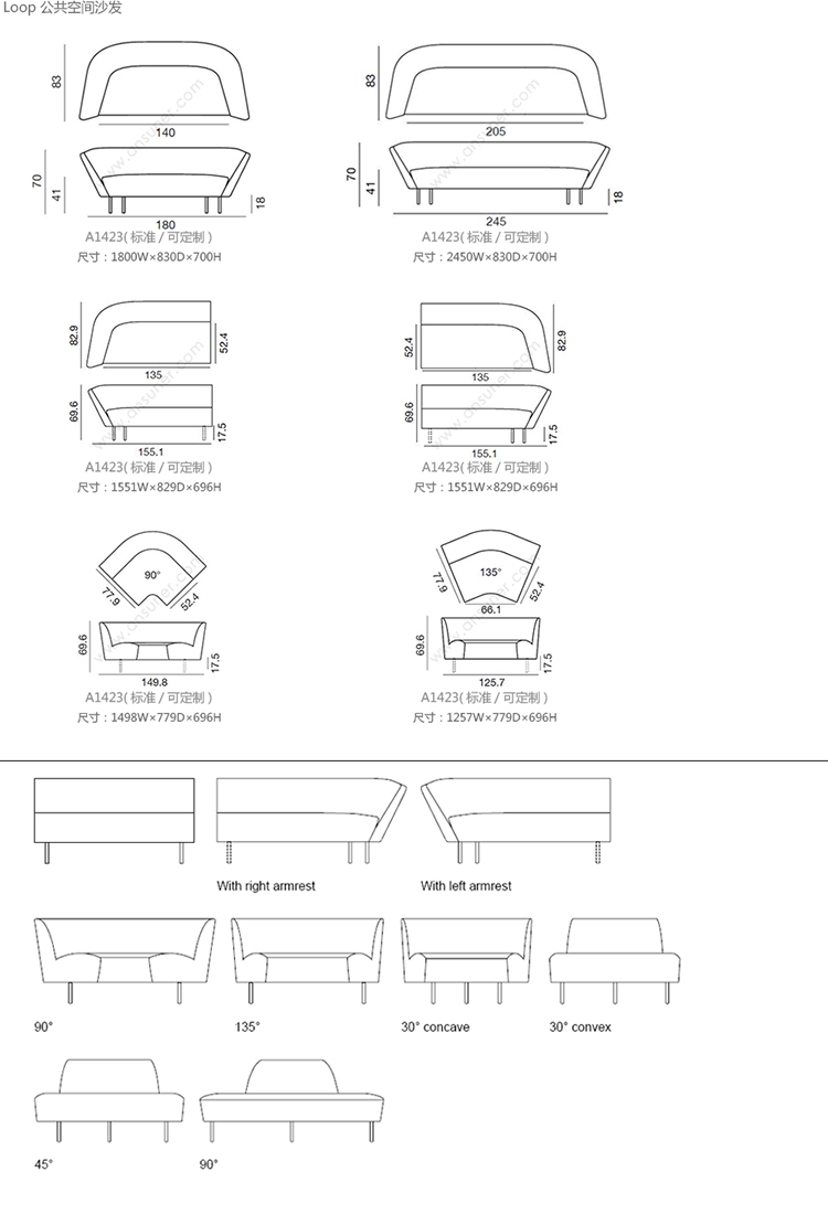Loop有一个带衬垫的木制框架,覆盖着织物,皮革,人造皮革或客户自己的面料。 框架安装在缎面钢结构上。 它的多功能性使Loop成为小型和大型空间的理想解决方案:客户可以选择两座或三座版本,也可以根据需要组合模块。 座垫有可拆卸的盖子。