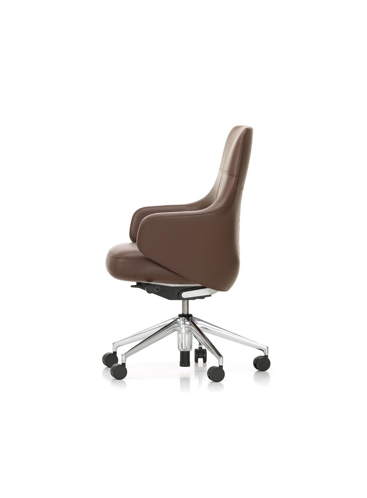 Grand Executive椅子结合了Grand Repos休闲椅的优雅,这是由Antonio Citterio为Vitra Home Collection设计的,具有现代办公椅的功能。 Grand Executive椅子的尊贵光环与时尚美感相得益彰。采用优质皮革制成,柔软的软垫内饰提供极致的舒适感。装饰性接缝凸显了椅子的手工细节,并勾勒出其体积结构。 FlowMotion机制可以适应个人用户,以确保每个坐姿的同步舒适度。 Grand Executive Highback模型配有可调节颈垫。