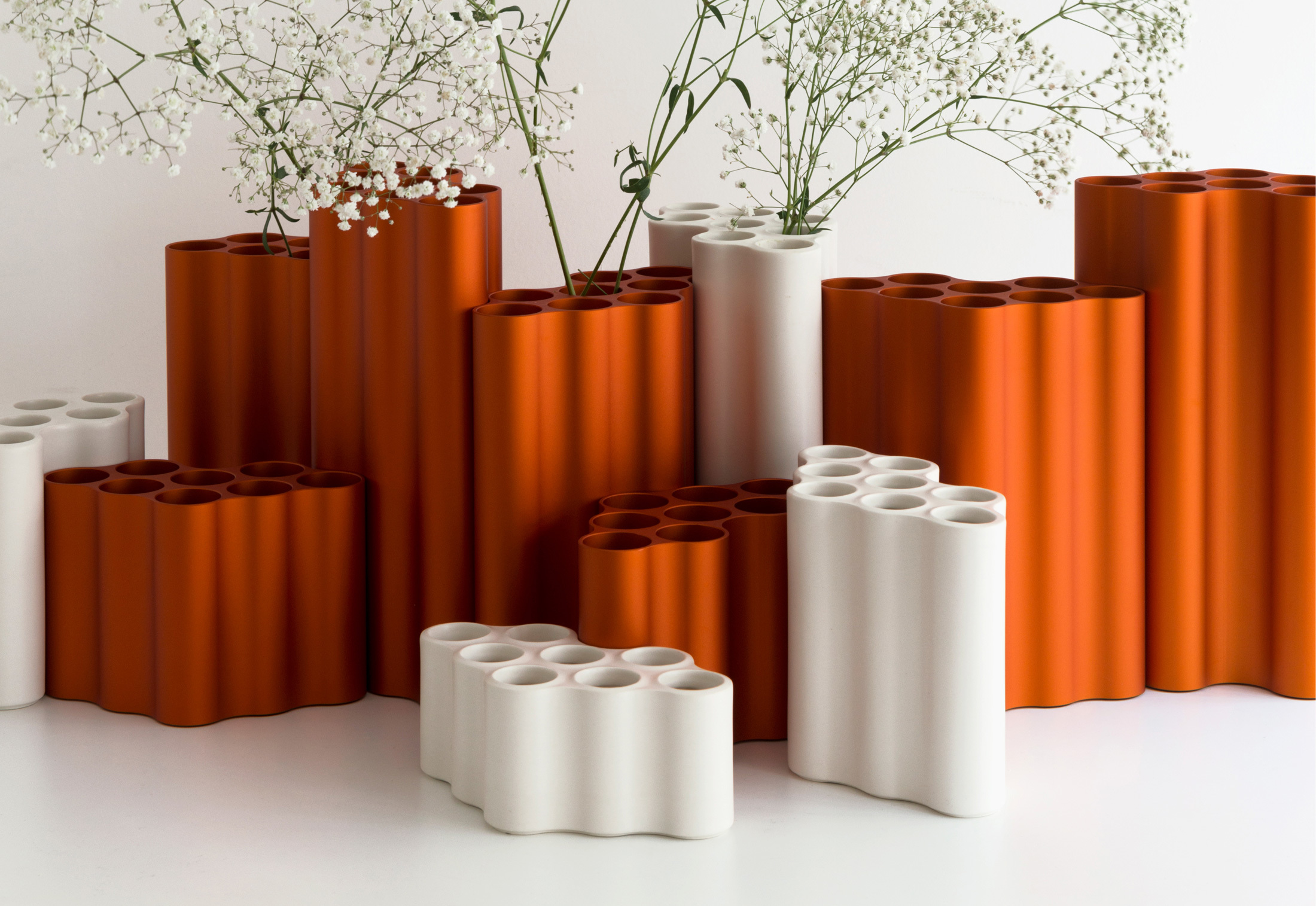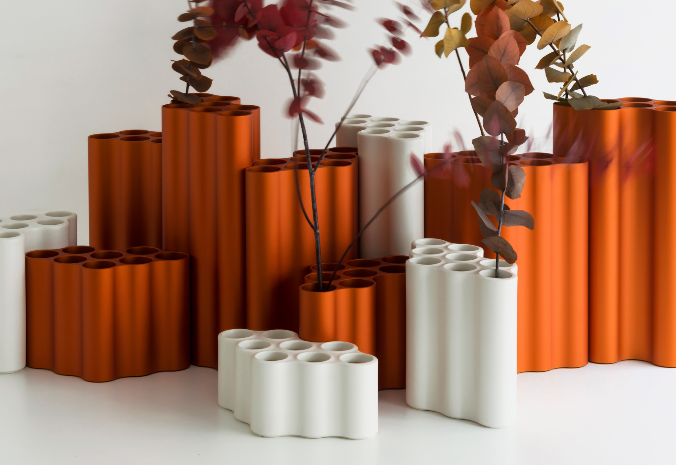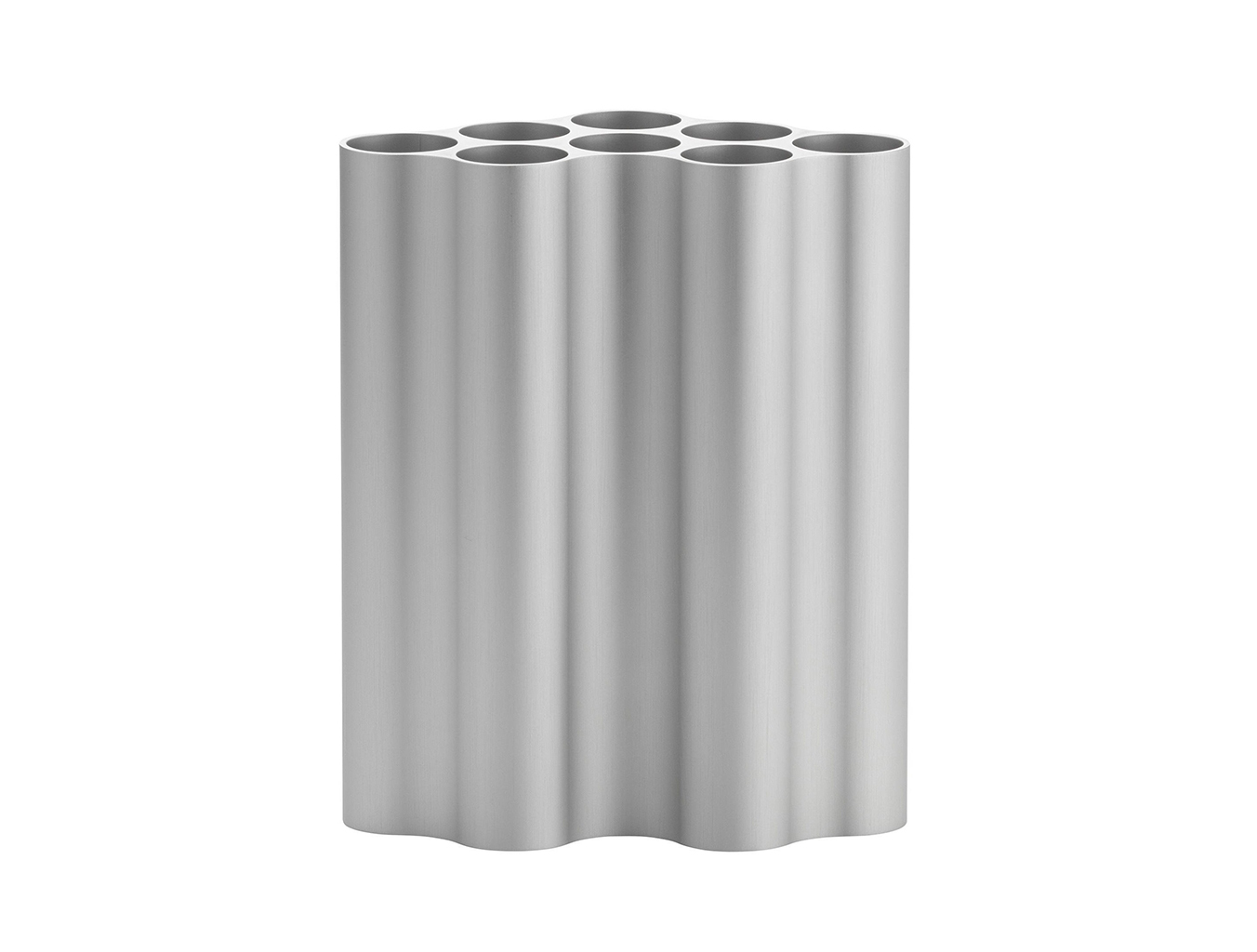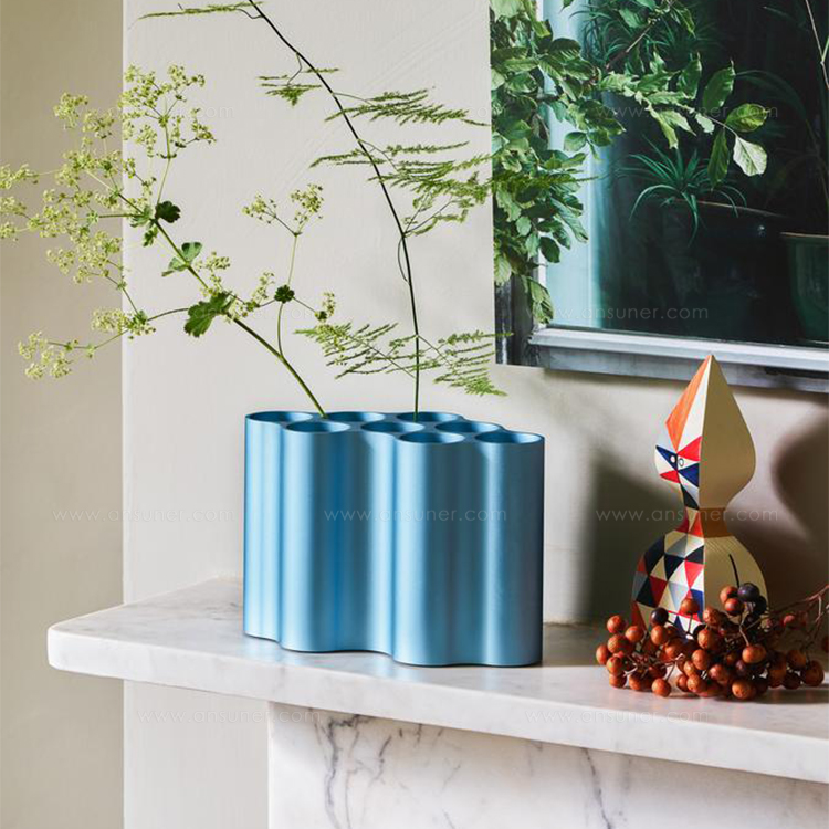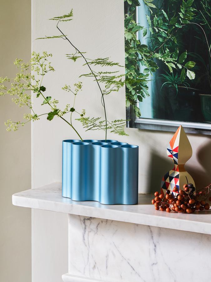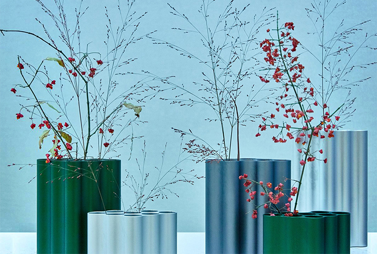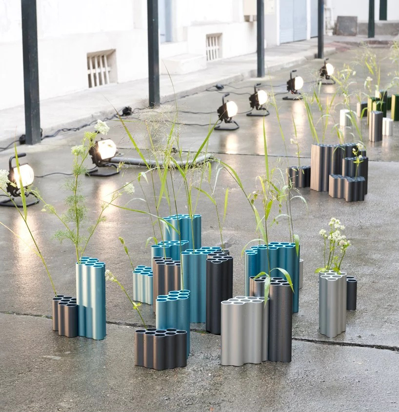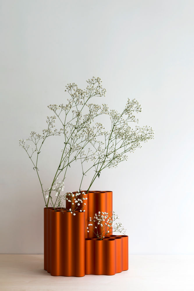 对于Nuage花瓶,设计师在不同长度的挤压铝型材中执行了云图案。基本形式的空腔现在直立放置,将花瓶分成八个单独的管,可用于巧妙地布置花和草。起伏的表面采用各种颜色的阳极氧化处理,营造出明亮的光影效果。由于其精确的外部轮廓,花瓶可以安装在一起,形成完整的“云层”。