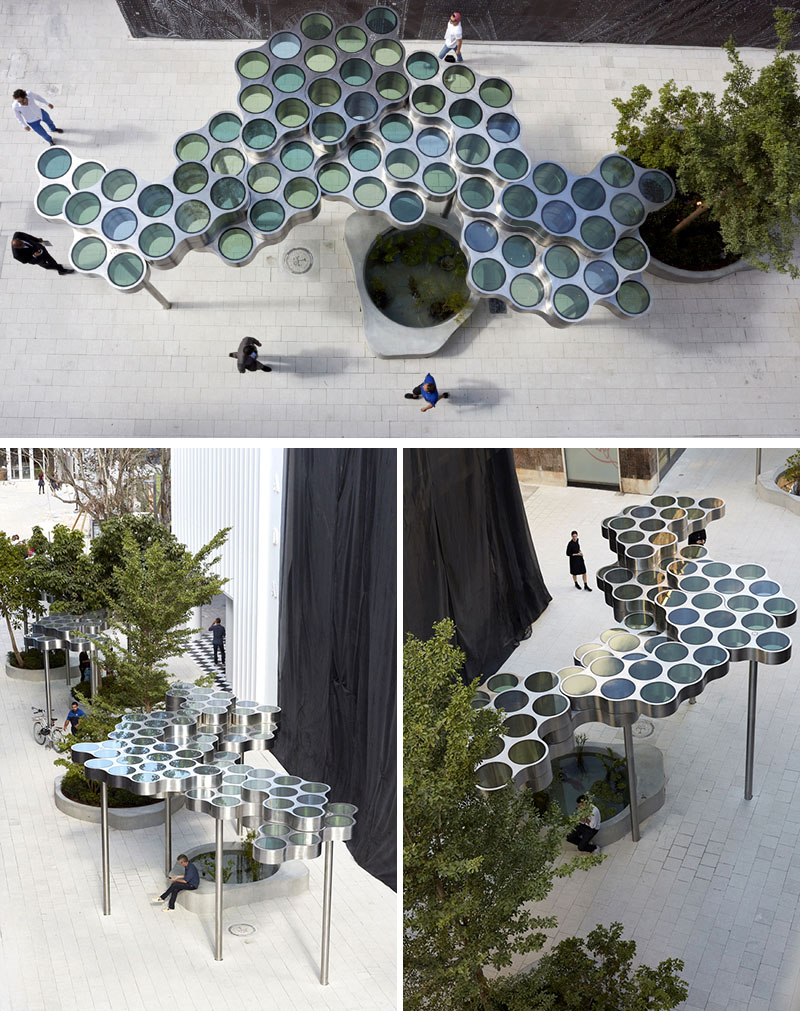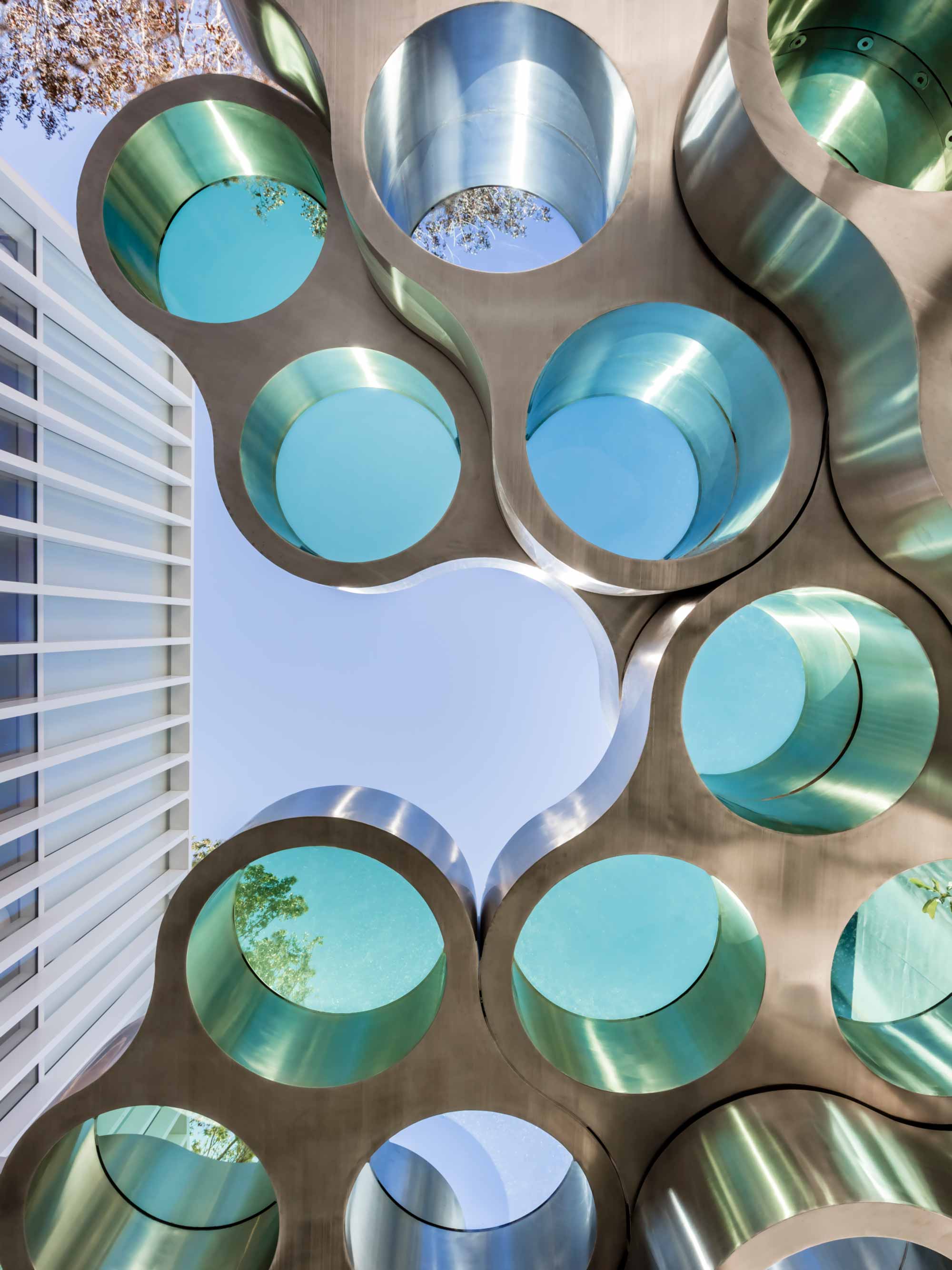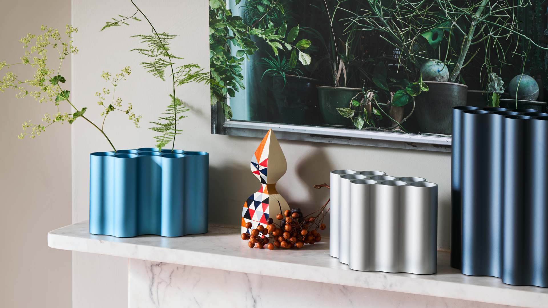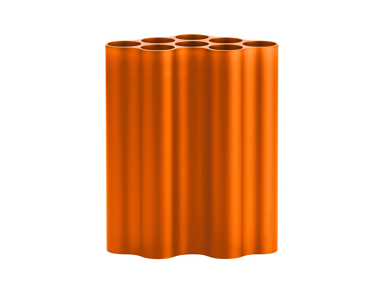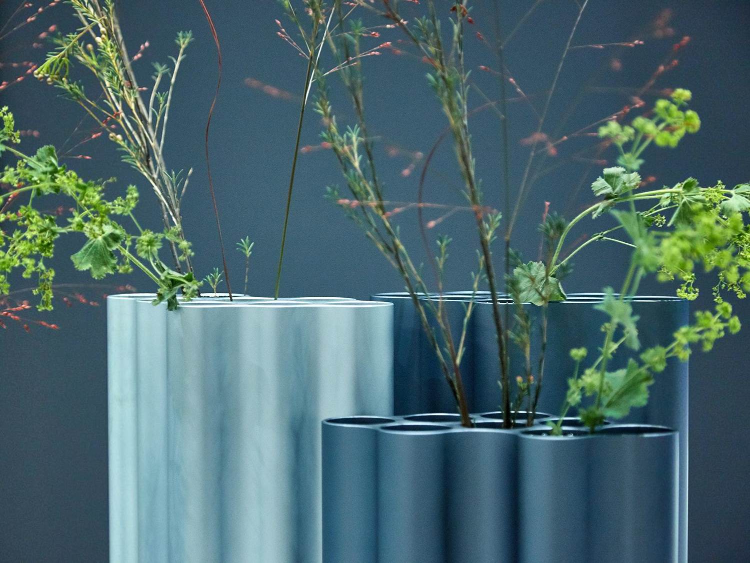 对于Nuage花瓶,设计师在不同长度的挤压铝型材中执行了云图案。基本形式的空腔现在直立放置,将花瓶分成八个单独的管,可用于巧妙地布置花和草。起伏的表面采用各种颜色的阳极氧化处理,营造出明亮的光影效果。由于其精确的外部轮廓,花瓶可以安装在一起,形成完整的“云层”。