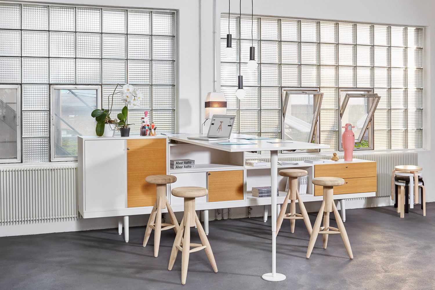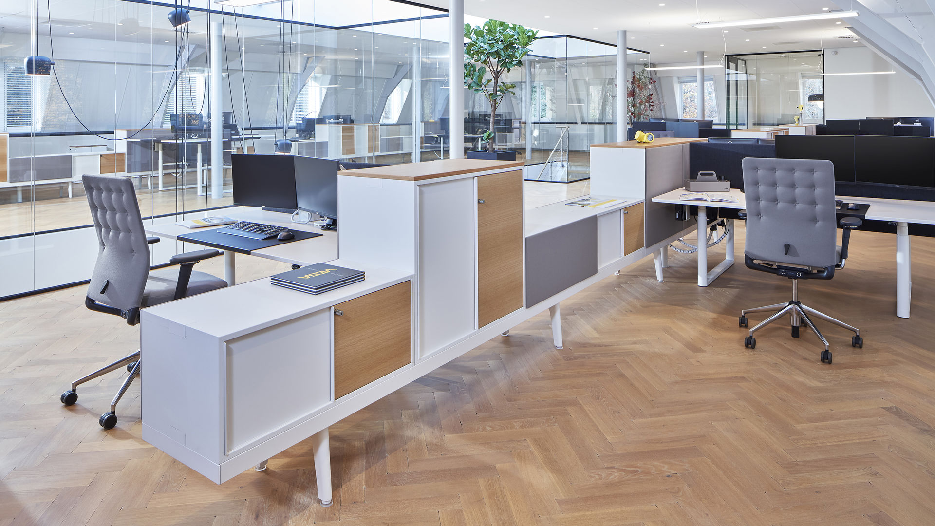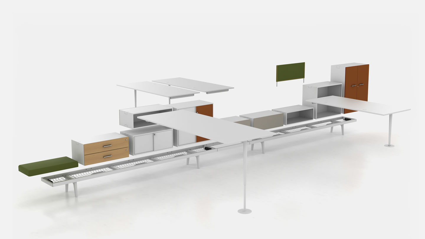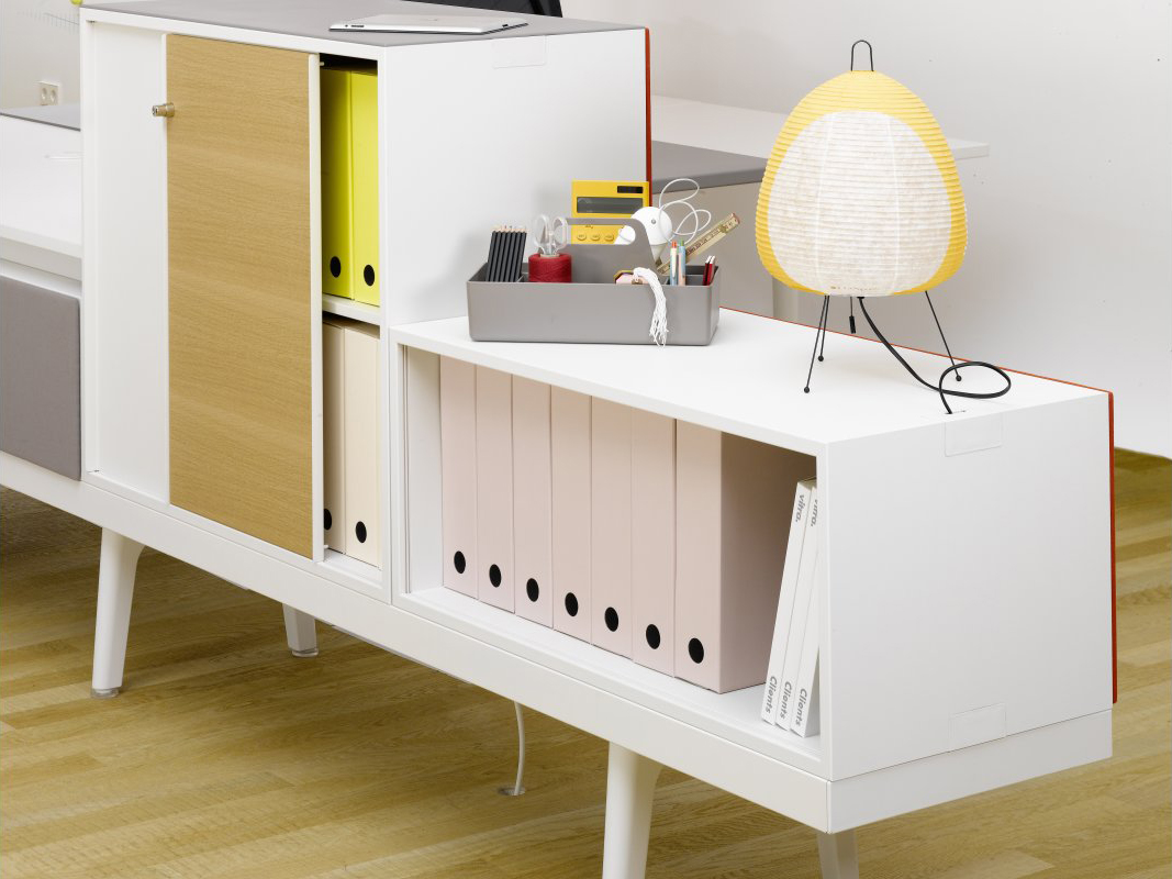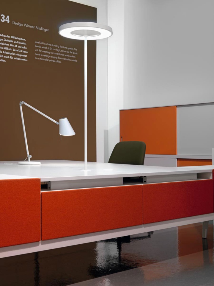 34级是办公家具系统,既可用于实现团队工作的解决方案,也可用于个人工作的工作站。 该系统基于34厘米高的工作台,使其看起来轻盈且漂浮。 工作台是电缆管理的平台,将橱柜,架子,桌子,座椅或花箱等模块放置在易于达到的水平。