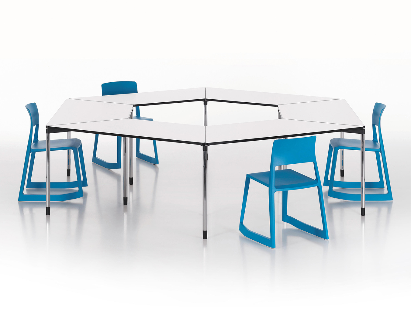 通过他们在建筑设计和培训和会议场地开发方面的经验,Edward Barber和Jay Osgerby开始意识到需要一种新的简单的桌面系统。 现代的,基于通信的表示和学习方法需要适应性的表格配置。 团队会议和研讨会通常在较小的表格集群中进行,而公开讨论适合于循环分组,而传统的演示要求面向演讲者的布局。 Map Table系统旨在满足这些不同的需求。 这些表格可以快速轻松地重新排列,并且可以根据需要进行堆叠。