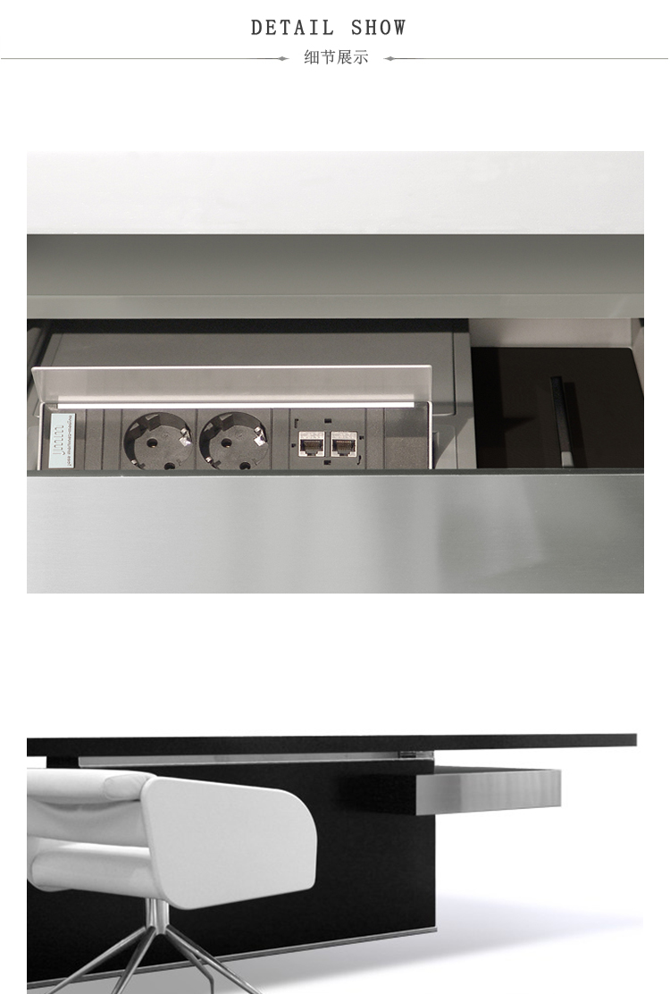 由于其金属核心结构,轻薄和加固的50毫米厚度桌面桌。工作桌面区域采用Techno Leather软垫。50mm结构前板在底部用不锈钢板完成。集成桌面电缆管理。(需要说明的是,桌面机翼在右侧或左侧,相对于工作桌面位置)