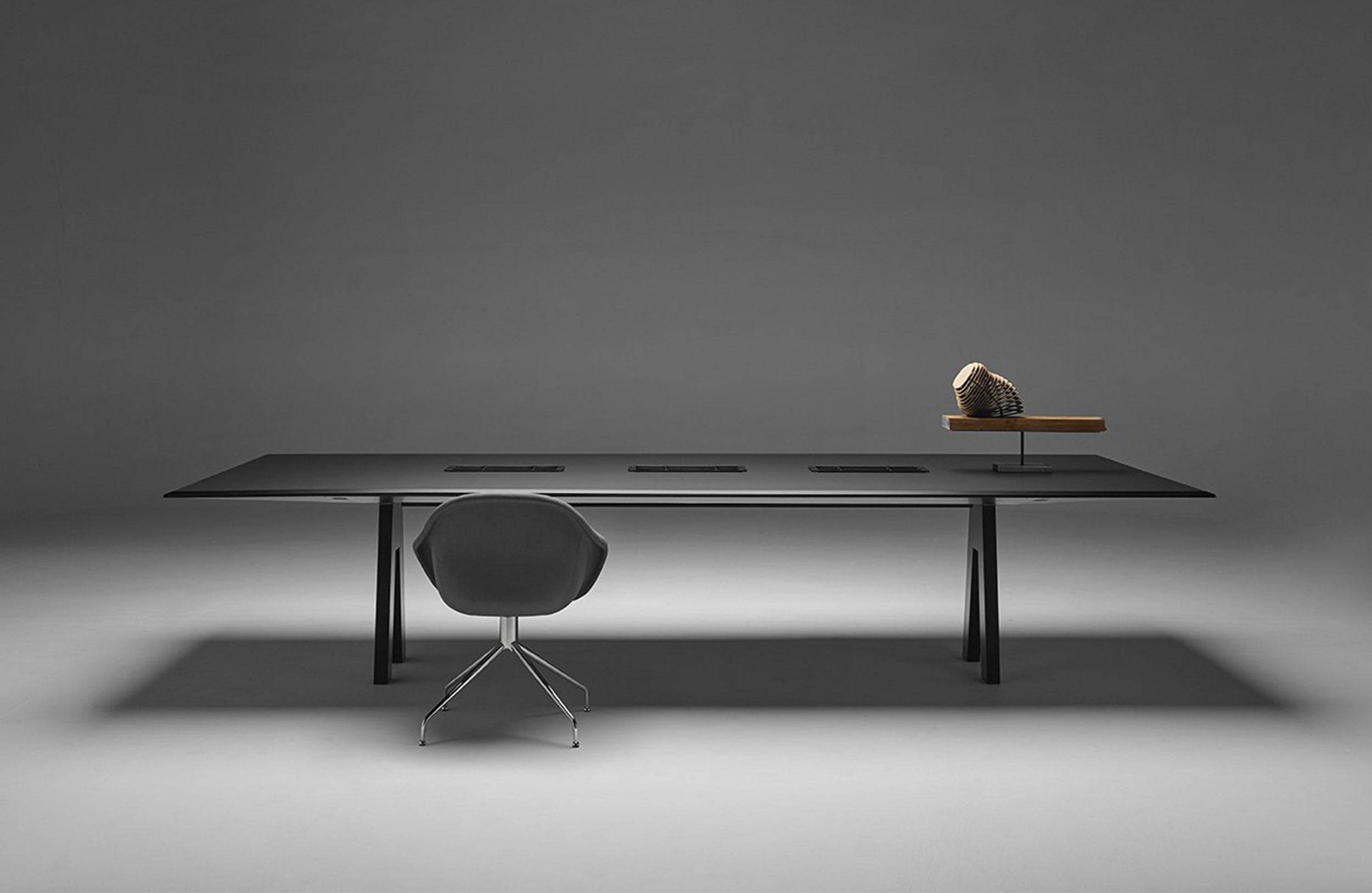 共同工作表。轻型结构底座,由4条倾斜支腿组成,采用漆面HDF(高密度纤维板)制成。顶部由折叠钢板制成,带有明显的斜面,形成10毫米厚的顶部。顶部突出的悬垂使其具有类似飞机机翼的轻盈感。顶级成品木材,漆或软垫Tech-Leather。包括电气化托盘(电气元件和电缆,不包括在内)。可拆卸笔筒/漆面漆面。可以用FéNIX材料(白色或黑色)完成桌面,并采用彩色不锈钢表面处理。