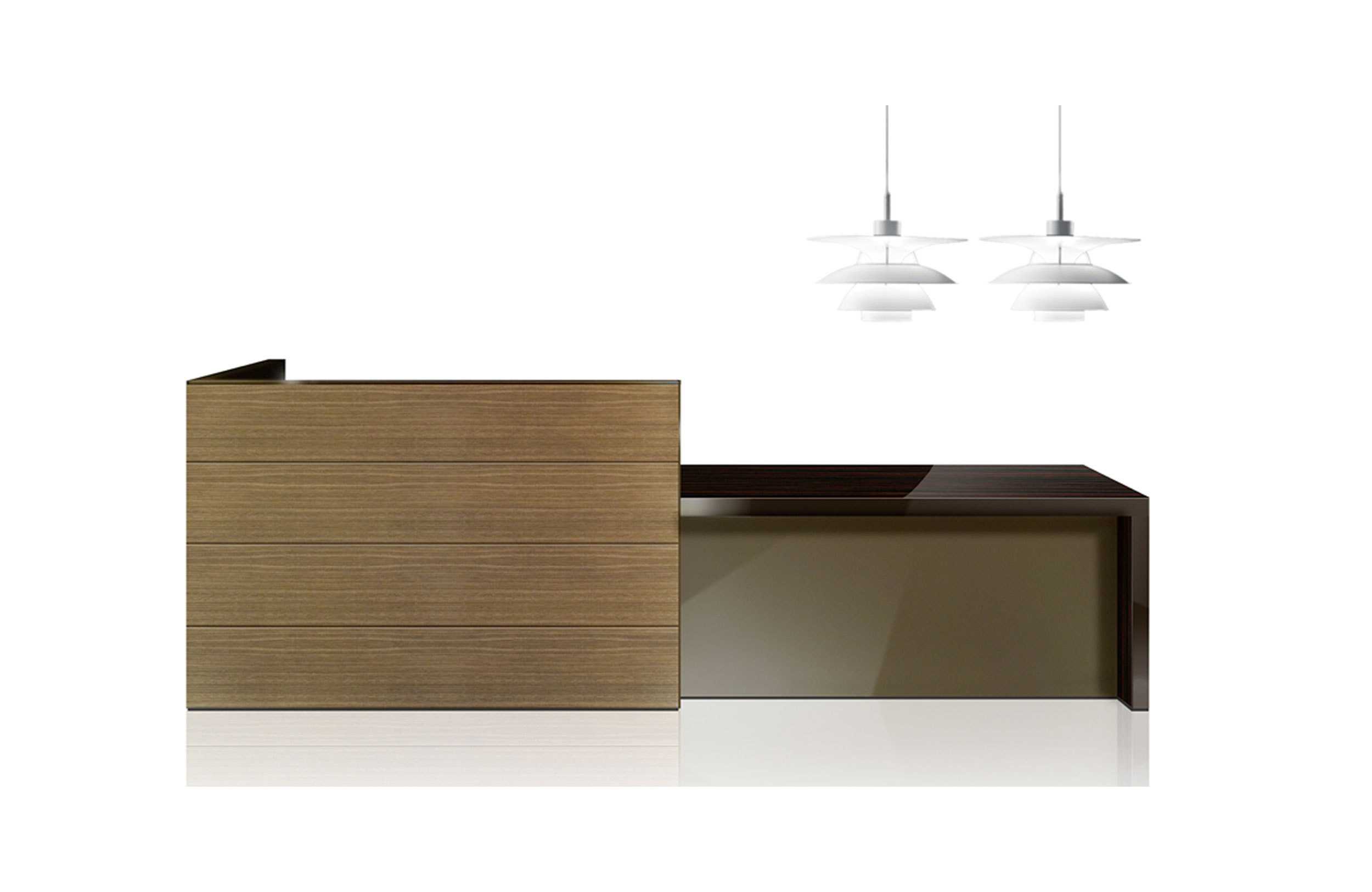 前台。高架的前板提供工作区域的亲密度和75厘米高度的桌子,用于通信和接近访客。表面处理:前板,天然木饰面。桌面,结合了Tech-Leather和微纹理漆面。下前板,微纹理漆面。咨询其他尺寸或形状。