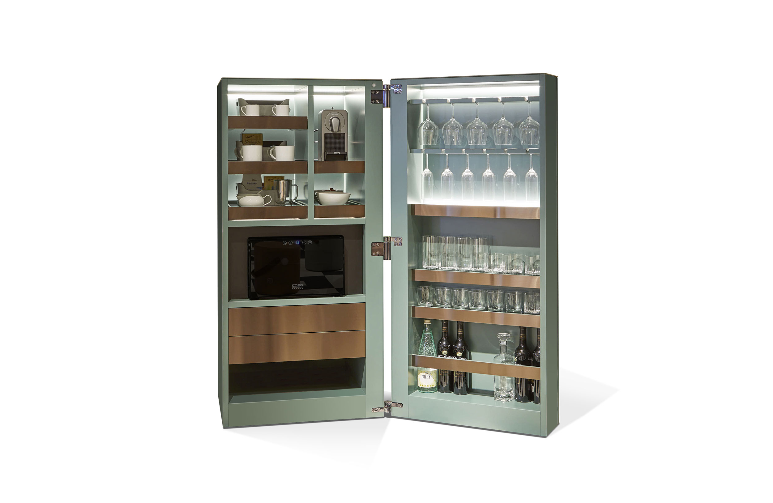 顶部,侧面门,背微膨体漆面内饰早在木材表面。在技术,皮革软垫盘彩色不锈钢。上层建筑货架和抽屉的阵地。在铰链黑镍。