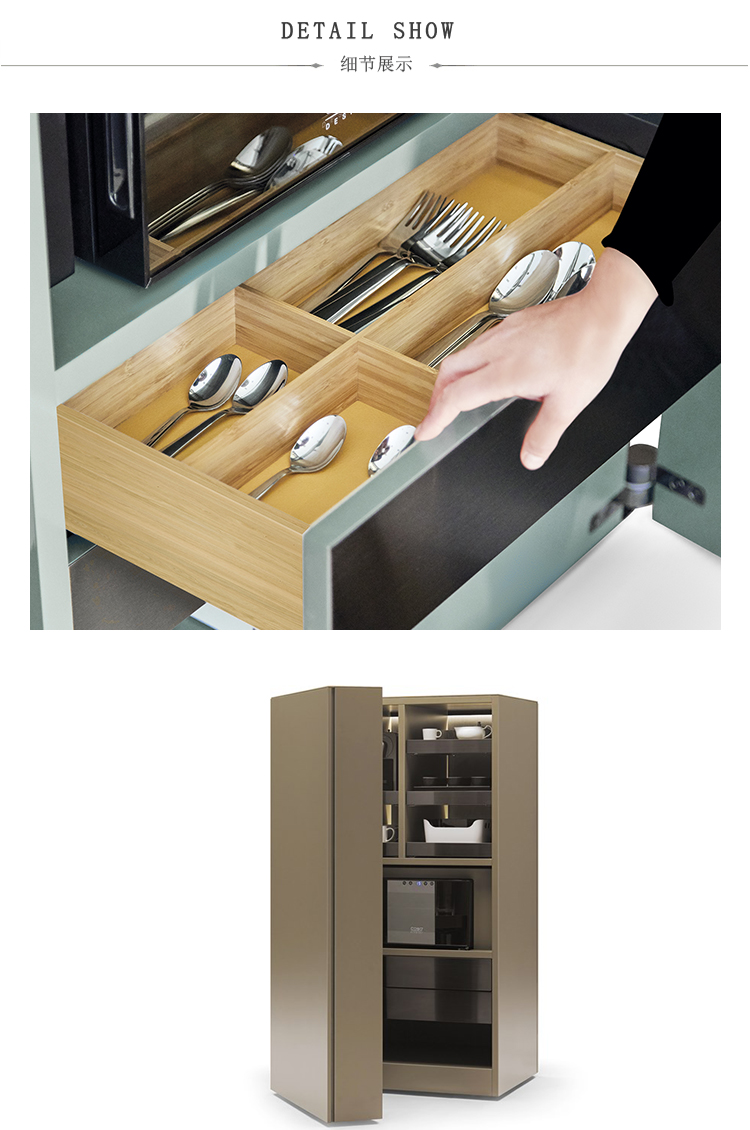 办公室厨房。一个隐藏必要厨具的柜子,可以适当地供应冷饮或热饮。配有Nespresso咖啡机和冰箱/酒架等电器。包括LED照明。表面处理:哑光漆的组合和木材