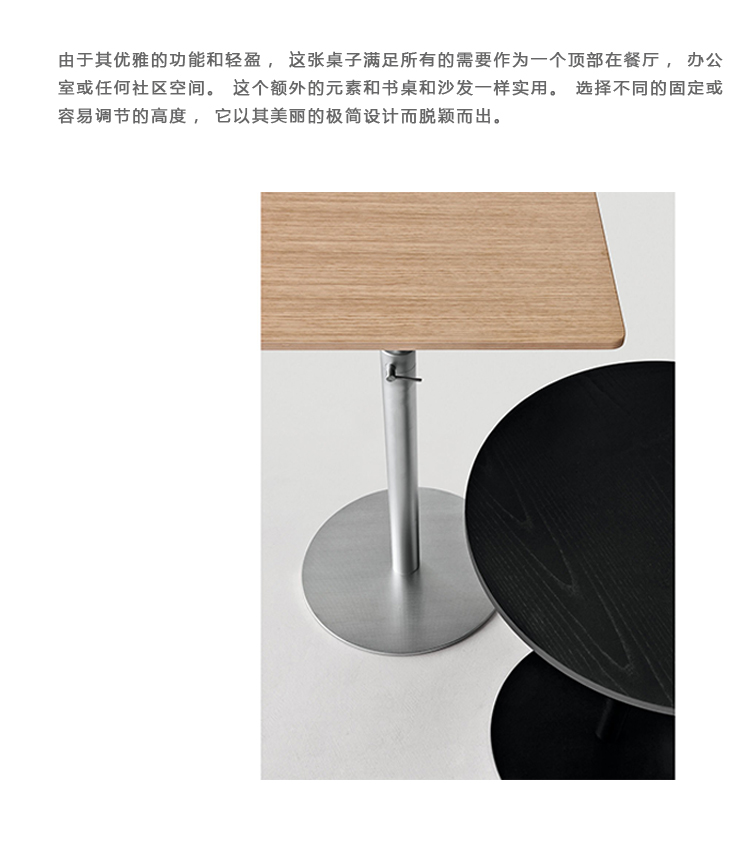 BRIO,即有趣、有用和多才多艺。由于其优雅的功能和轻盈,这张桌子满足所有的需要作为一个顶部在餐厅,办公室或任何社区空间。这个额外的元素和书桌和沙发一样实用。选择不同的固定或容易调节的高度,它以其美丽的极简设计而脱颖而出。