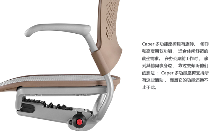 Caper多功能座椅具有旋转、倾仰和高度调节功能,适合休闲舒适的就坐需求。在办公桌前工作时,移到其他同事身边,靠过去倾听他们的想法:Caper多功能座椅支持所有这些活动,而且它的功能还远不止于此。