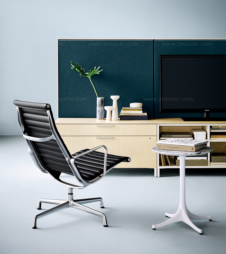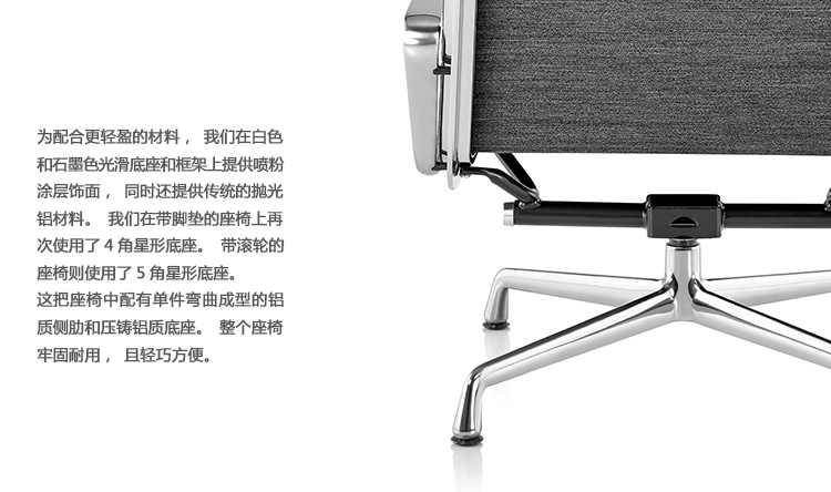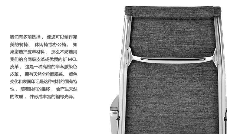 Charles与RayEames夫妇是20世纪最有影响力的设计师,卓越的设计涵盖了家具、建筑、影像与平面设计。他们从二次世界大战中美国海军的实验计画中学习经验并发展可谓是现今工业中使用模铸胶合版的先锋,这对设计界的超级夫妇档自1940年参与了由MOMA举办的有机家具设计大赛,自今已有近百件他们的作品被各大博物馆所永久典藏。 Eames® Soft Pad Side Chair(伊姆斯软包会议椅)是夫妻俩1958年设计的,是在全铝系列的基础上发展的另一系列Eames产品。舒适系列在全铝的椅架上增加了皮革制的柔软坐垫和靠背,高级铝合金制作,压模四星脚,可旋转。背垫和坐垫,采用西皮,具有透气性强,内部填充高密度定型绵,不易变形,不老化,依人体坐姿,符合人体工学,耐水及对人体无害等优势。椅子扶手选用优质电镀铝合金扶手,手感舒适,永久不生锈。转椅底盘为多功能底盘,可以保护使用者长时间坐用腿部健康,且作为高度可多定位调节。气压棒采用的气杆是正规厂家出产的外贸气杆,每一根气杆都有钢印,经过严格SGS检测的才可出厂,旋转、升降自如基本无声响,使用寿命长,可承受250kg,可升降数万次,将椅面调至与膝盖同高时,使用者坐下后双脚跟可垂直平放于地上,且大腿与地面平行,最符合人体工学理论,使用者长期久坐,也不想疲惫。办公椅脚为铝合金材质永久不生锈、承受能力强,安全更放心。椅子脚轮采用优质电镀片脚轮,耐用而美观,可以随意变换位置,贴心更方便,具有防震及防松脱,让椅子的安全性能更加可靠。