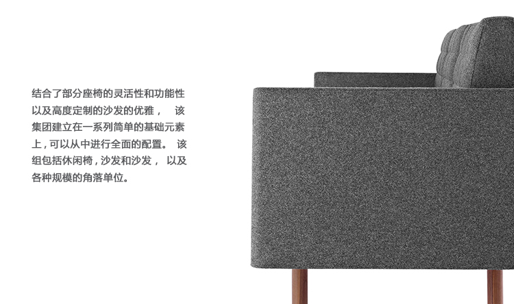 Tuxedo休闲座椅由细窄的钢腿提供支撑,金属支腿有6种饰面可选,靠背和(可选)扶手形成一条水平横线,让座椅的整个线条轮廓看起来十分低沉、流畅。超薄、双层泡沫衬垫外面包裹清新定制的装饰,让沙发看起来更加轻巧。每款装饰系列都包括有绗缝或无绗缝两种选项。