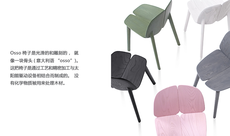 Osso椅子是光滑的和雕刻的,就像一块骨头(意大利语“osso”)。这把椅子是通过工艺和精密加工与太阳能驱动设备相结合而制成的。没有化学物质被用来处理木材。