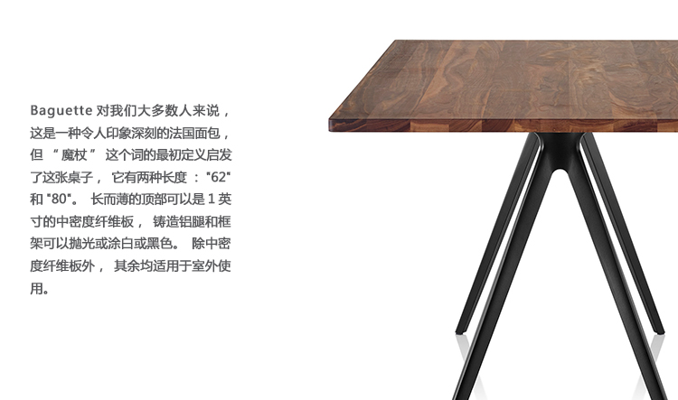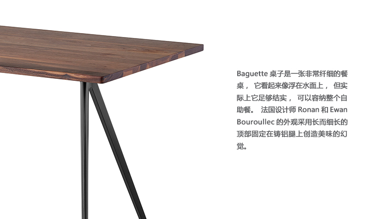 Baguette桌子是一张非常纤细的餐桌,它看起来像浮在水面上,但实际上它足够结实,可以容纳整个自助餐。法国设计师Ronan和EwanBouroullec的外观采用长而细长的顶部固定在铸铝腿上创造美味的幻觉。