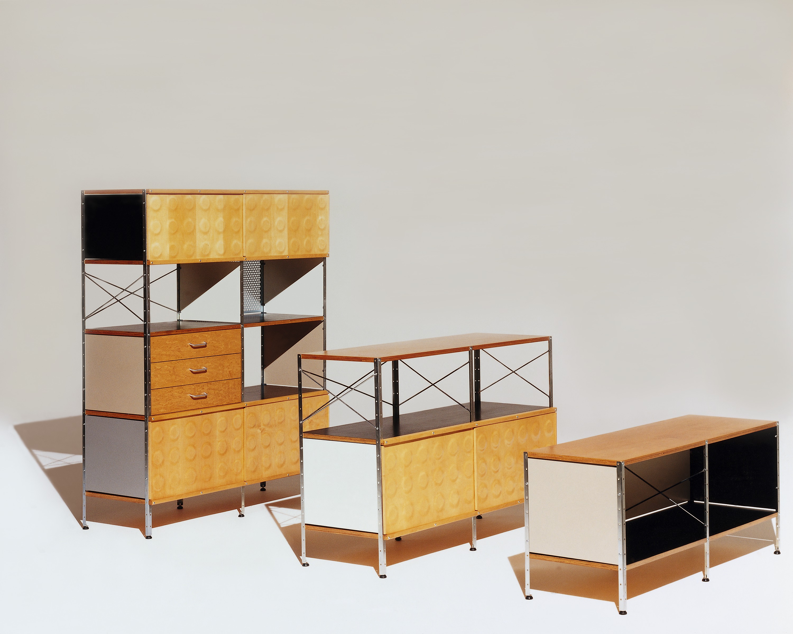 Eames存储单元由五种配置和四种大小的箱子、橱柜和抽屉组成。立柱、交叉支撑板和穿孔板要么是镀锌的,要么是黑色的;橱柜的正面是凹凸不平的胶合板;抽屉的正面和架子是模制的胶合板;箱体侧面和背面的面板是涂硬木的。可供您选择两种配色方案:中性色或亮色。
