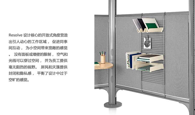 Resolve设计核心的开放式角度营造出引人动心的工作区域,促进同事间互动,为小空间带来宽敞的感觉。没有面板或墙壁的限制,空气和光线可以穿过空间,并为员工提供毫无阻挡的视野。屏风和天篷提供封闭和隐私感,平衡了设计中过于空旷的感觉。