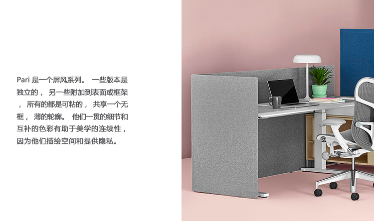 Pari是一个屏幕系列。 有些版本是独立式的,有些版本是贴在表面或框架上的,所有版本都是可粘的,并且共享无框架,薄的外形。 它们一致的细节和互补的颜色有助于美学的连续性,因为它们描绘了空间并提供了隐私。 Pari Screens与许多Herman Miller产品兼容,可在办公室环境中进行设置。 使用Pari Screens,组织可以压缩工作站并在较低的墙壁高度进行标准化,而不会牺牲员工所需的隐私,以便他们可以集中注意力,或创建个人空间的边界让他们感到舒适。