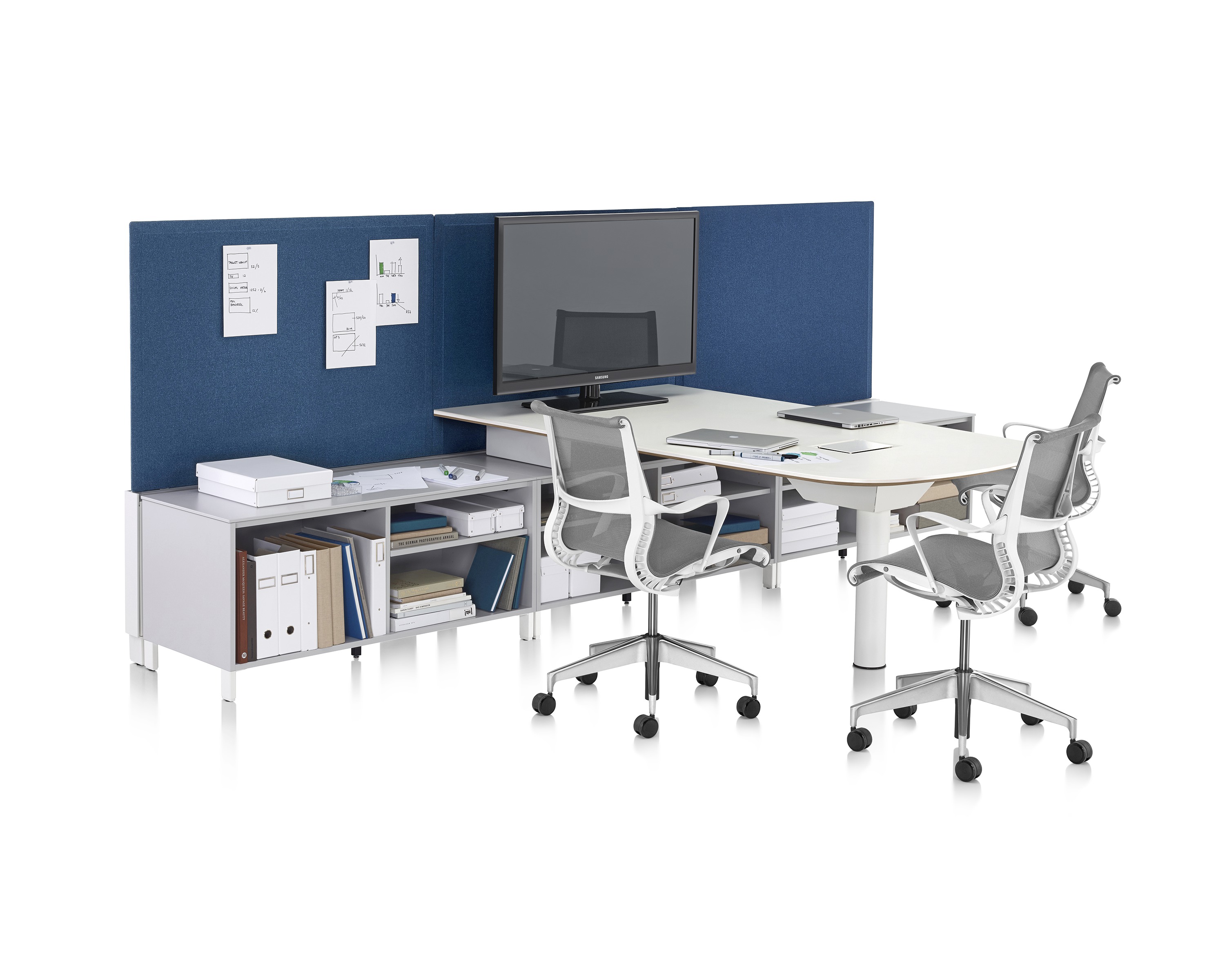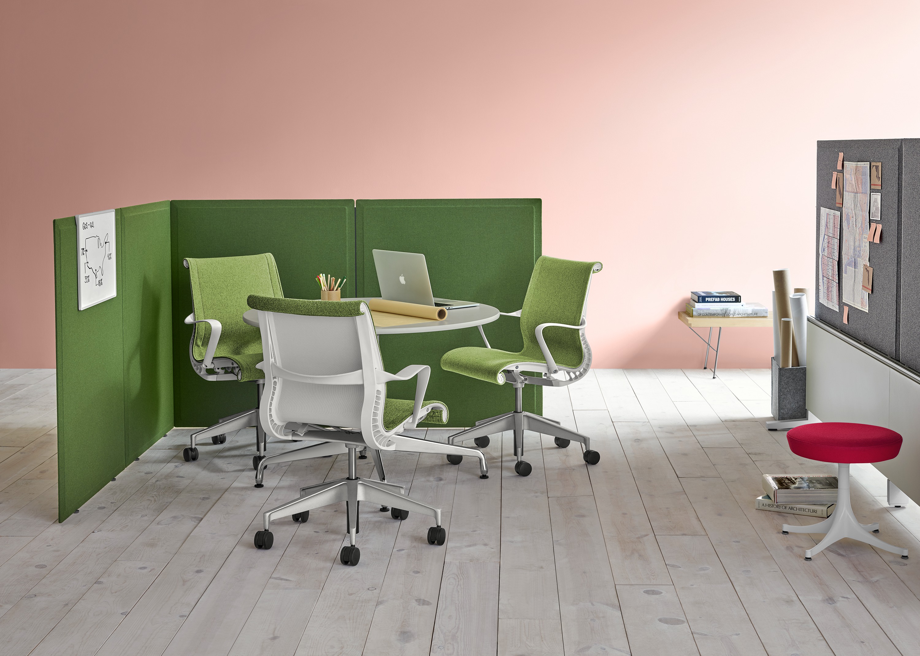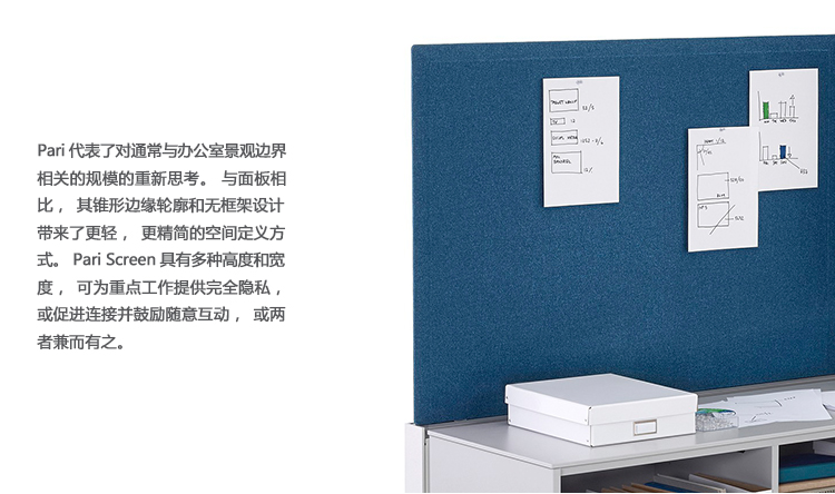 Pari是一个屏幕系列。 有些版本是独立式的,有些版本是贴在表面或框架上的,所有版本都是可粘的,并且共享无框架,薄的外形。 它们一致的细节和互补的颜色有助于美学的连续性,因为它们描绘了空间并提供了隐私。 Pari Screens与许多Herman Miller产品兼容,可在办公室环境中进行设置。 使用Pari Screens,组织可以压缩工作站并在较低的墙壁高度进行标准化,而不会牺牲员工所需的隐私,以便他们可以集中注意力,或创建个人空间的边界让他们感到舒适。