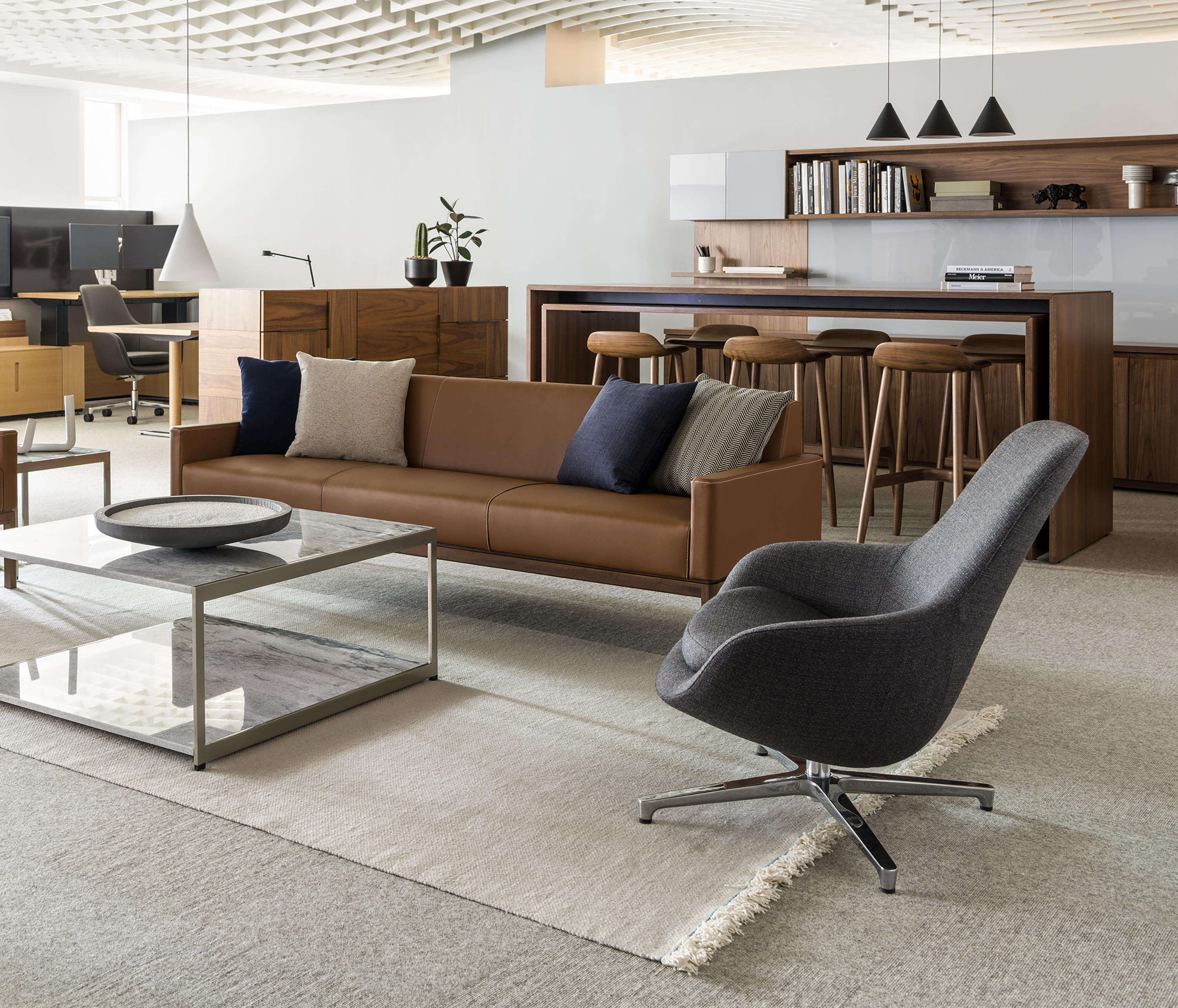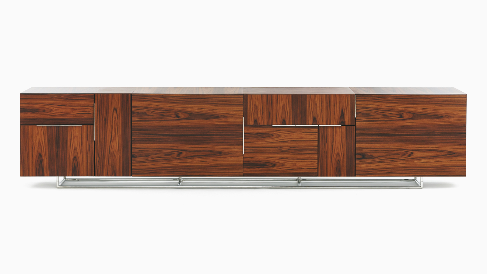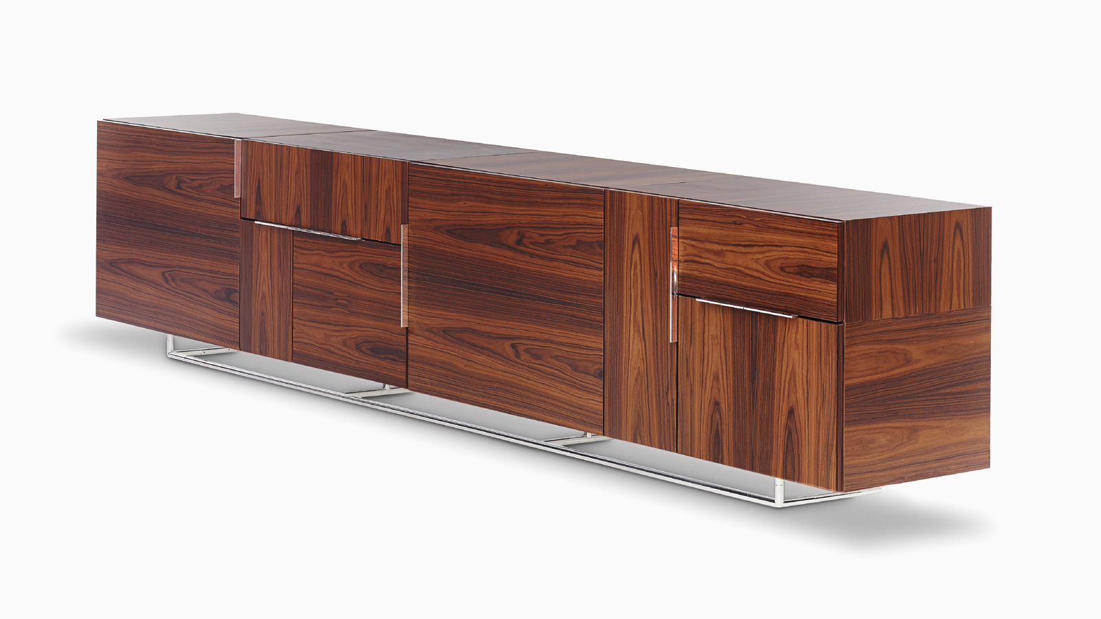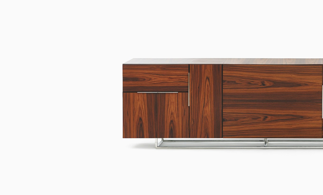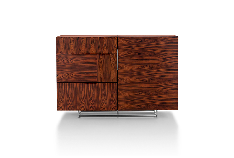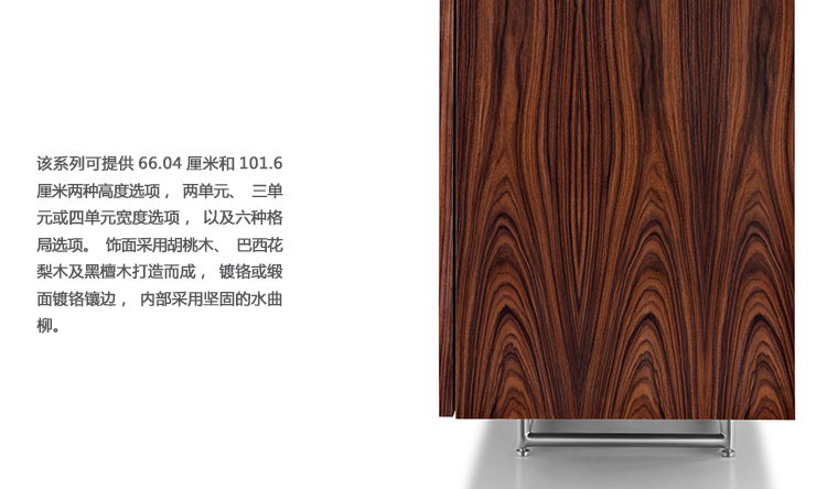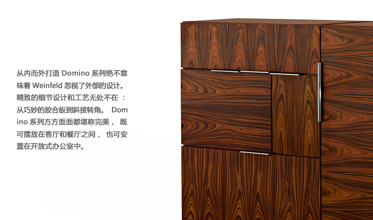 从内而外打造Domino系列绝不意味着Weinfeld忽视了外部的设计。精致的细节设计和工艺无处不在:从巧妙的胶合板到斜接转角。Domino系列方方面面都堪称完美,既可摆放在客厅和餐厅之间,也可安置在开放式办公室中。该系列可提供66.04厘米和101.6厘米两种高度选项,两单元、三单元或四单元宽度选项,以及六种格局选项。饰面采用胡桃木、巴西花梨木及黑檀木打造而成,镀铬或缎面镀铬镶边,内部采用坚固的水曲柳。