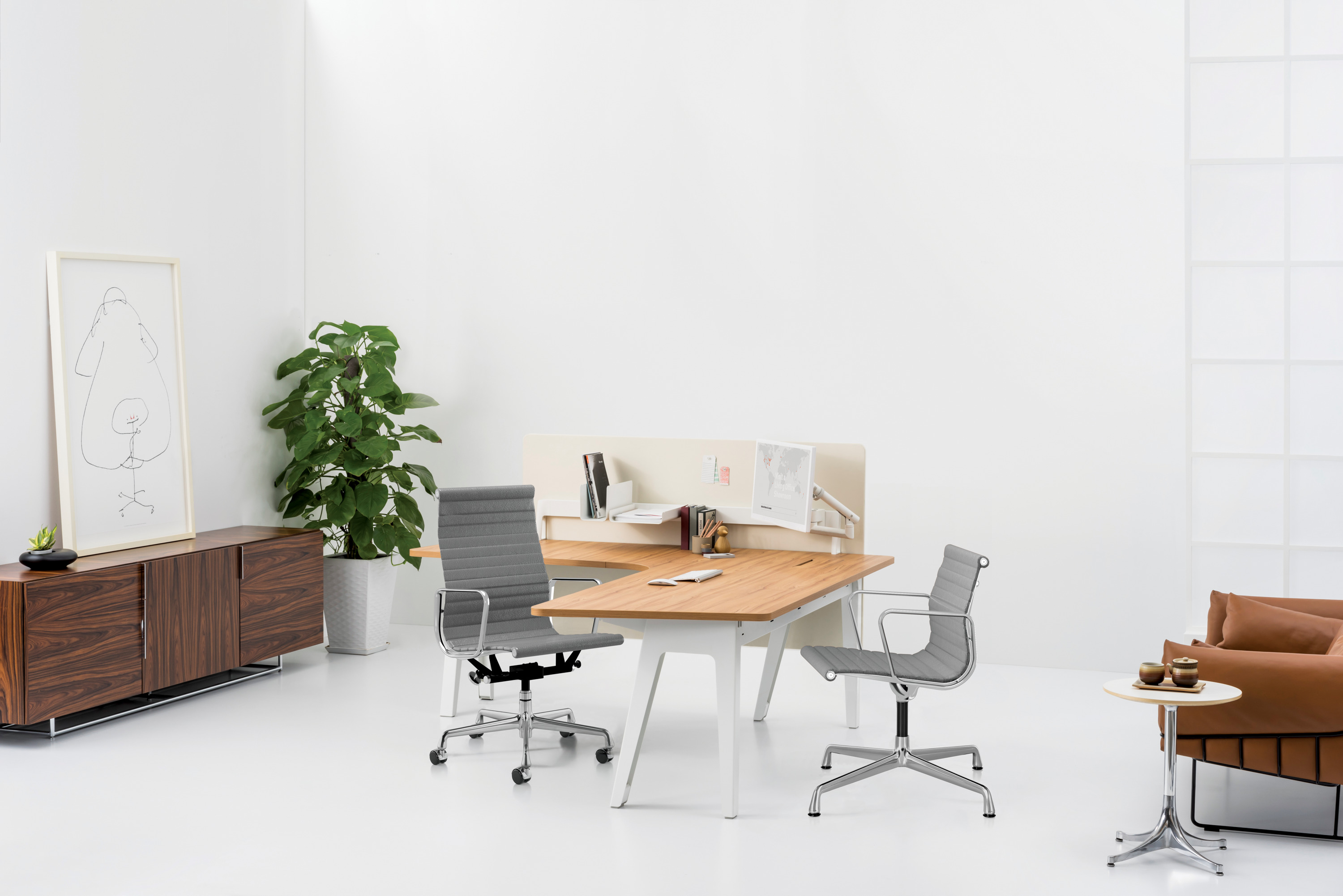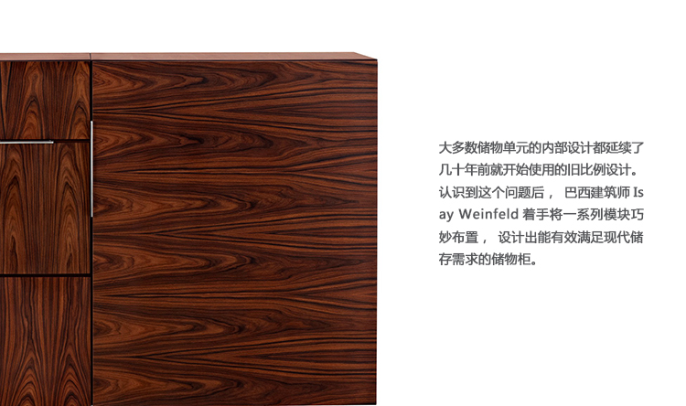 大多数储物单元的内部设计都延续了几十年前就开始使用的旧比例设计。认识到这个问题后,巴西建筑师Isay Weinfeld着手将一系列模块巧妙布置,设计出能有效满足现代储存需求的储物柜。“我们掏空了办公室的柜子,将所有东西都放在地板上,然后问自己,‘储存这些东西需要的理想空间有多大?’这些东西包括打印机、活页夹、铅笔,甚至是垃圾桶。”他说到。确定合适的比例之后,他开始设计一种系统,以便能将这些模块有效组合,使他们能够调整到适用于立柜、地柜或办公桌的合适高度。