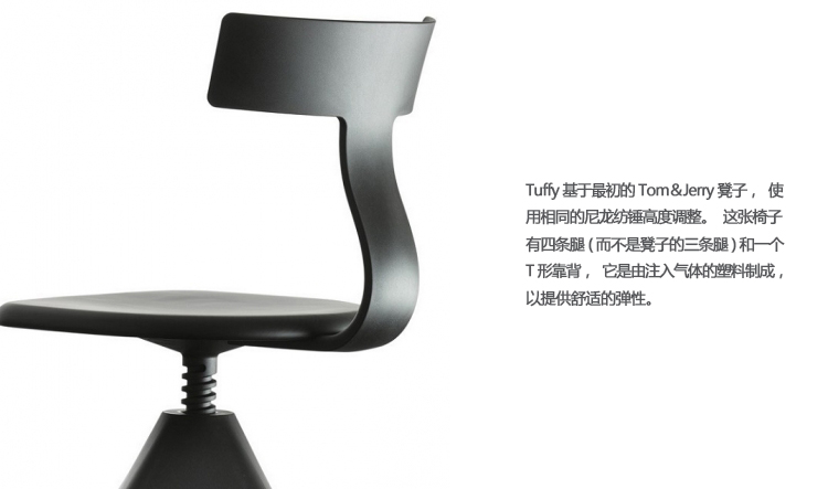 Tuffy基于最初的Tom&Jerry凳子,使用相同的尼龙纺锤高度调整。这张椅子有四条腿(而不是凳子的三条腿)和一个T形靠背,它是由注入气体的塑料制成,以提供舒适的弹性。Tuffy是一张多功能的椅子,可以在工作室/办公室、学校、午餐咖啡馆、厨房桌子周围或孩子的卧室里。座椅和腿是用实心山毛榉制成的,塑料零件有黑色或白色两种颜色。
