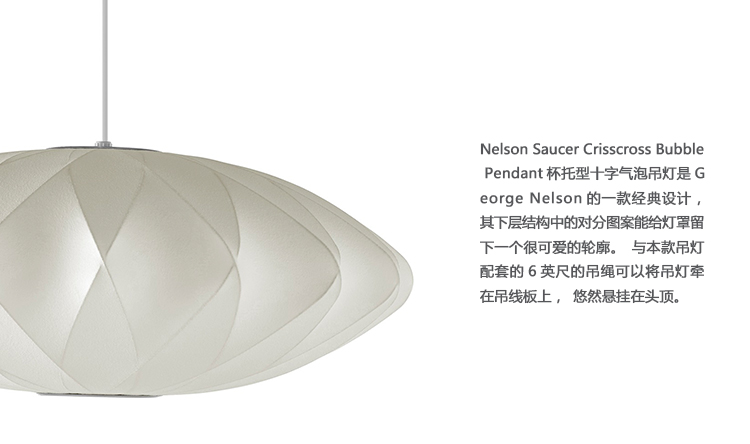 Nelson Saucer Crisscross Bubble Pendant杯托型十字气泡吊灯是George Nelson的一款经典设计,其下层结构中的对分图案能给灯罩留下一个很可爱的轮廓。与本款吊灯配套的6英尺的吊绳可以将吊灯牵在吊线板上,悠然悬挂在头顶。Nelson最先于1952年设计了这些气泡灯,当时他偶尔碰到一组很喜欢的瑞典吊灯。但其高昂的价格让Nelson产生了自己设计的念头。其结果就是一系列简单的球状外形面世了,比如圆圆的苹果、宽大的杯托、加长的雪茄和造型优美的梨,等等。