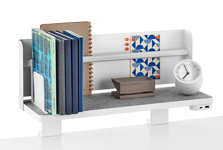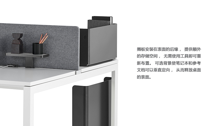 搁板安装在表面的后缘,提供额外的存储空间,无需使用工具即可重新布置。 可选背景使笔记本和参考文档可以垂直定向,从而释放桌面的表面。