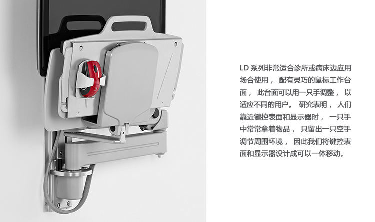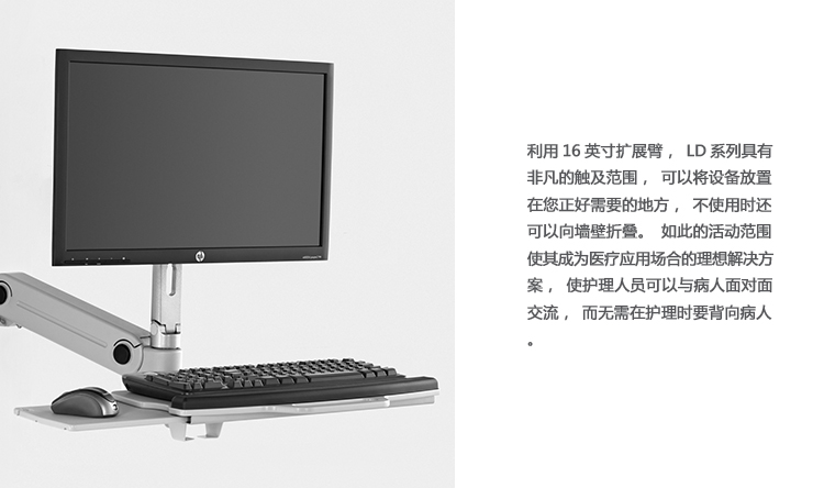 利用16英寸扩展臂,LD系列具有非凡的触及范围,可以将设备放置在您正好需要的地方,不使用时还可以向墙壁折叠。如此的活动范围使其成为医疗应用场合的理想解决方案,使护理人员可以与病人面对面交流,而无需在护理时要背向病人。