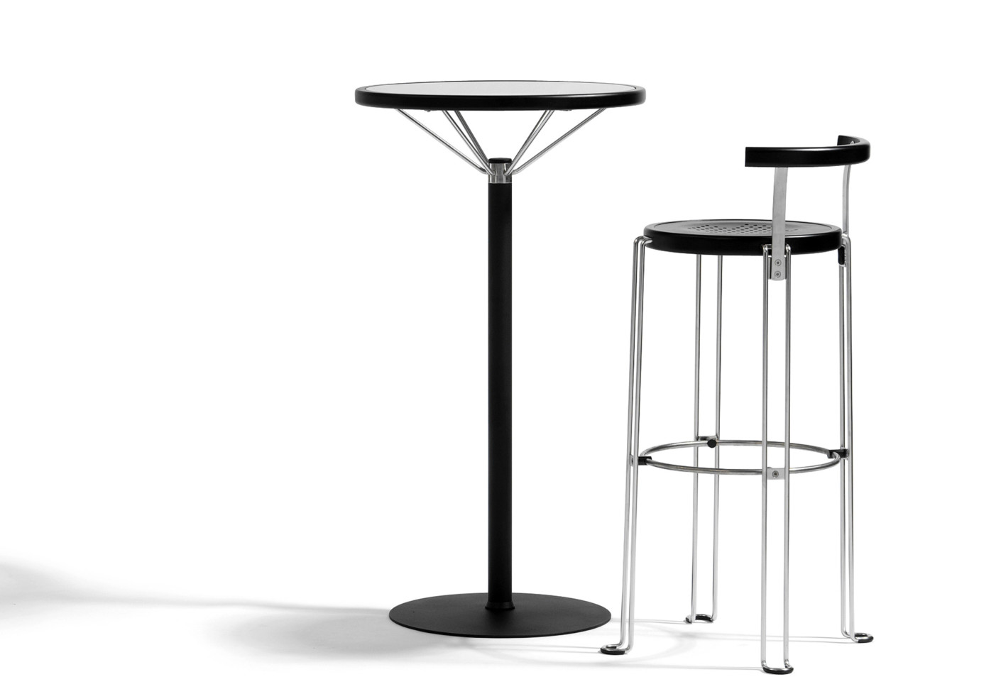 基座和踏脚板在涂漆钢。辐条在不锈钢。在压缩模制的层胶桦木帘布层表轮缘。表顶部在玻璃表高度590/710/890/1060毫米,桌面Ø480/580/680 mm,踏板Ø450 mm,重量kg 11,4-13,5。