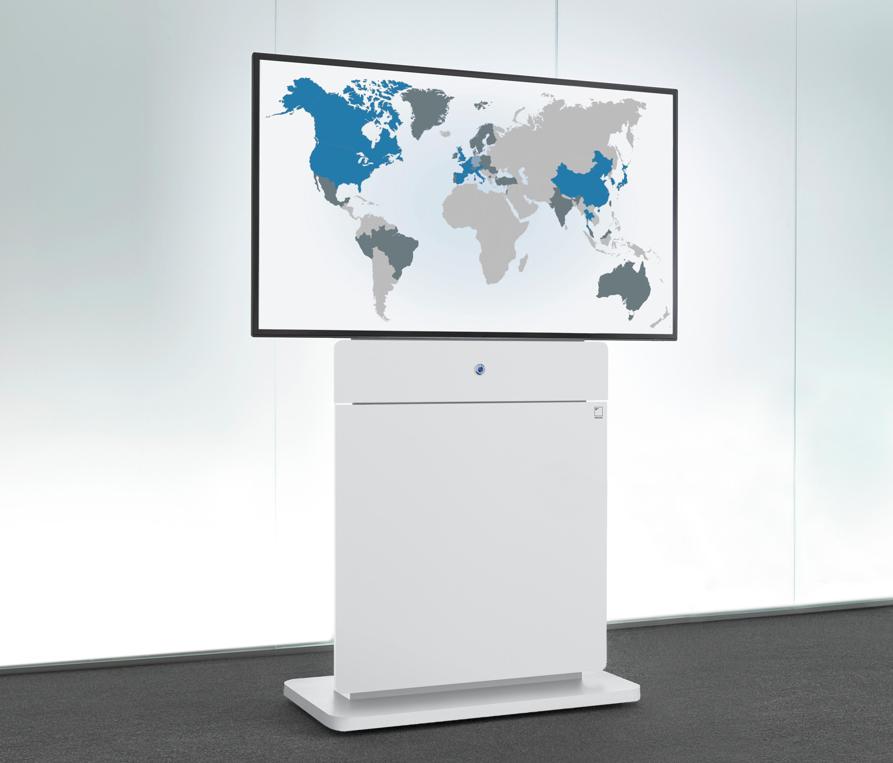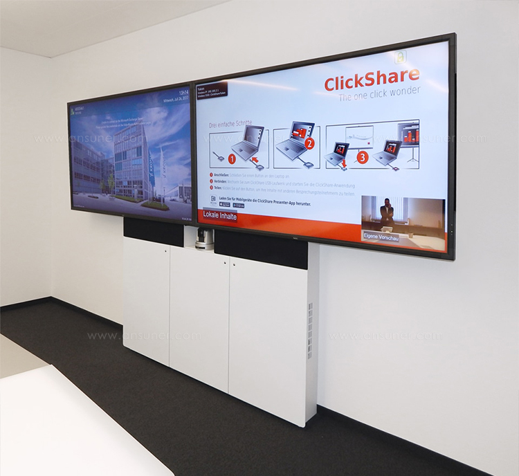 纤细的移动多媒体墙W8凭借着高功能性和灵活性的设计令人喜爱。集成的插头和播放控制系统提供了一个自由的多媒体方案,改变了用户的会议自由性。多种屏幕尺寸可供选择,适合于各种大小不同的会议室要求。