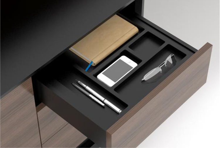 抽屉一触即开,采用按压式反弹导轨,内含文具盘.办公台 实景/空间展示