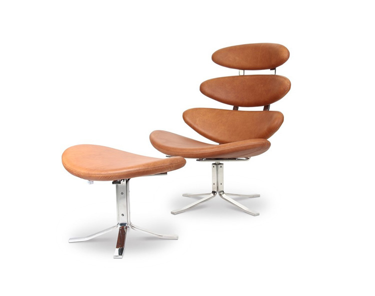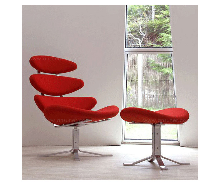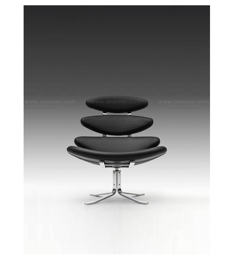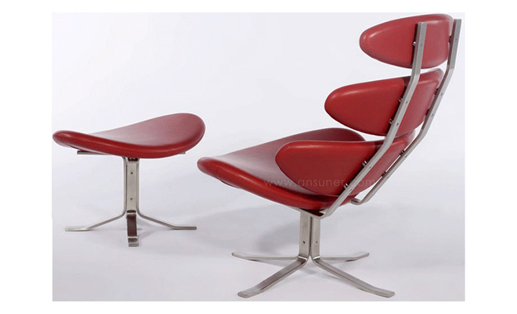 Poul M. Volther 于1964年的设计的王冠躺椅家具系列,是Poul M. Volther最知名的现代家具设计作品,此系列包括Corona Lounger Chair(王冠躺椅)、Corona Lounger Ottoman (王冠休闲脚踏)及其组合Corona Lounger Chair and Ottoman(王冠躺椅&脚踏)。历经40余年的今天,其作品在纷繁现代家具设计中仍占有一席之地。椅子充满了雕塑感,斯堪德维亚风格的简洁外形和舒适的坐感都是这张椅子成为创世之作的原因,四个椭圆形组成一张独特的椅子,无论摆放在哪,都令人过目不忘。此系列家具采用高强度钢材制作,表面电镀处理,外面为真皮或布艺制作,可360度旋转,不可后仰。适用范围广,酒店、会所、高档餐厅、夜总会、别墅等。