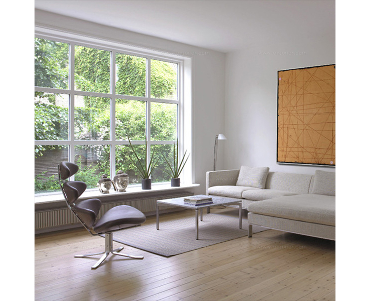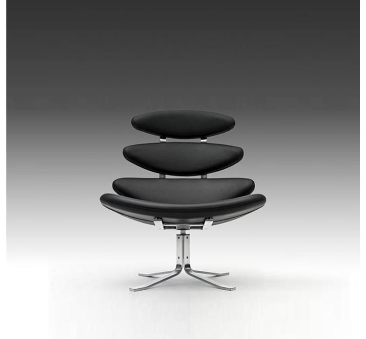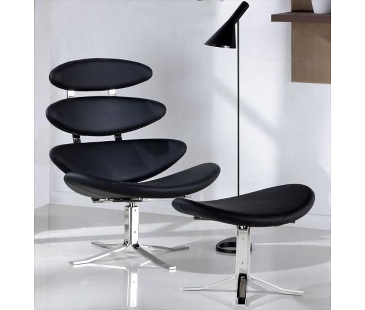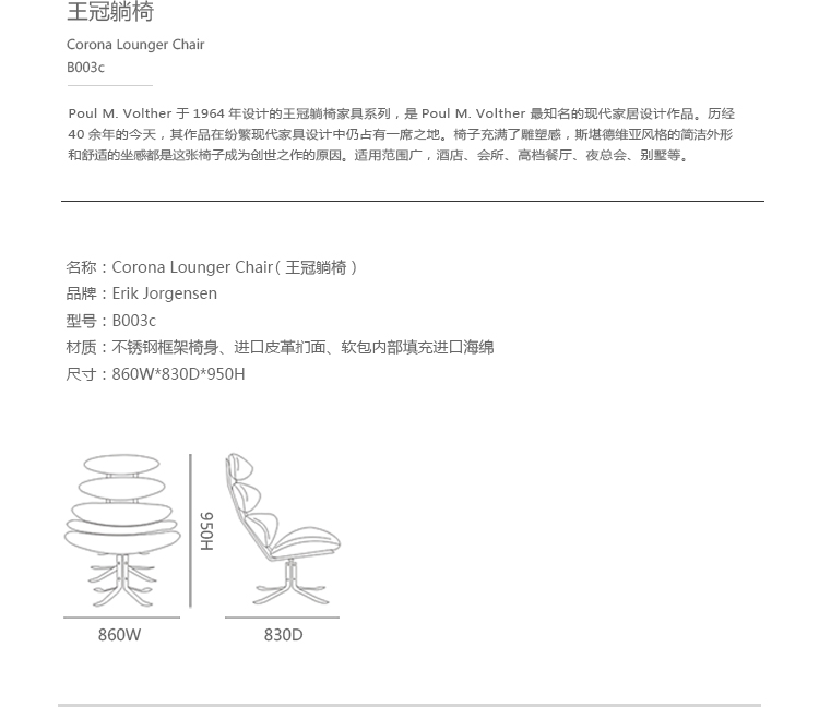 Poul M. Volther 于1964年的设计的王冠躺椅家具系列,是Poul M. Volther最知名的现代家具设计作品,此系列包括Corona Lounger Chair(王冠躺椅)、Corona Lounger Ottoman (王冠休闲脚踏)及其组合Corona Lounger Chair and Ottoman(王冠躺椅&脚踏)。历经40余年的今天,其作品在纷繁现代家具设计中仍占有一席之地。椅子充满了雕塑感,斯堪德维亚风格的简洁外形和舒适的坐感都是这张椅子成为创世之作的原因,四个椭圆形组成一张独特的椅子,无论摆放在哪,都令人过目不忘。此系列家具采用高强度钢材制作,表面电镀处理,外面为真皮或布艺制作,可360度旋转,不可后仰。适用范围广,酒店、会所、高档餐厅、夜总会、别墅等。