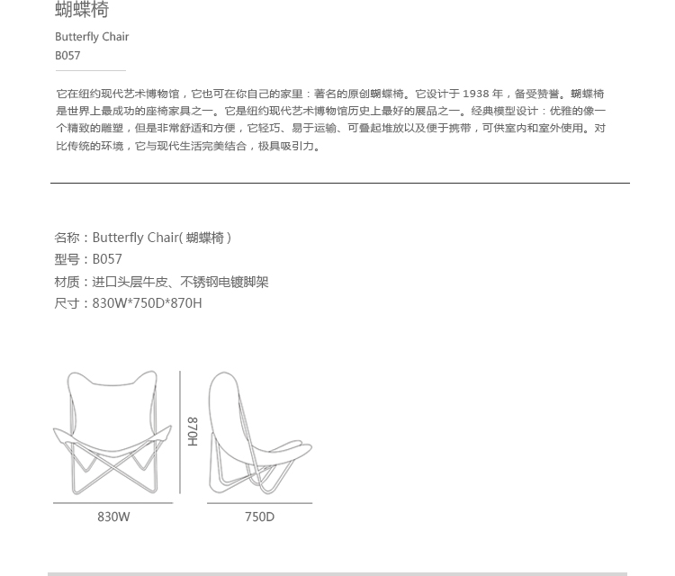 它在纽约现代艺术博物馆,它也可在你自己的家里:著名的原创蝴蝶椅。它设计于1938年设计,倍受赞誉。蝴蝶椅是世界上最成功的座椅家具之一。它是纽约现代艺术博物馆历史上最好的展品之一。经典模型设计:优雅的像一个精致的雕塑,但是非常舒适和方便,它轻巧、易于运输、可叠起堆放以及便于携带,可供室内和室外使用。对比传统的环境,它与现代生活完美结合,极具吸引力。它的框架由钢条弯曲形成大环状然后焊接而成。得益于敞开的结构,它看起来就像金银丝细工的艺术品。你可以舒服地坐下,靠在宽敞的座位上。塑料脚垫甚至可以在最滑的地面上提供一个稳定的支撑。这套典雅的不锈钢座椅,我们可给您提供各种颜色进行选择。拉丝不锈钢模型适合室内也适合户外使用。