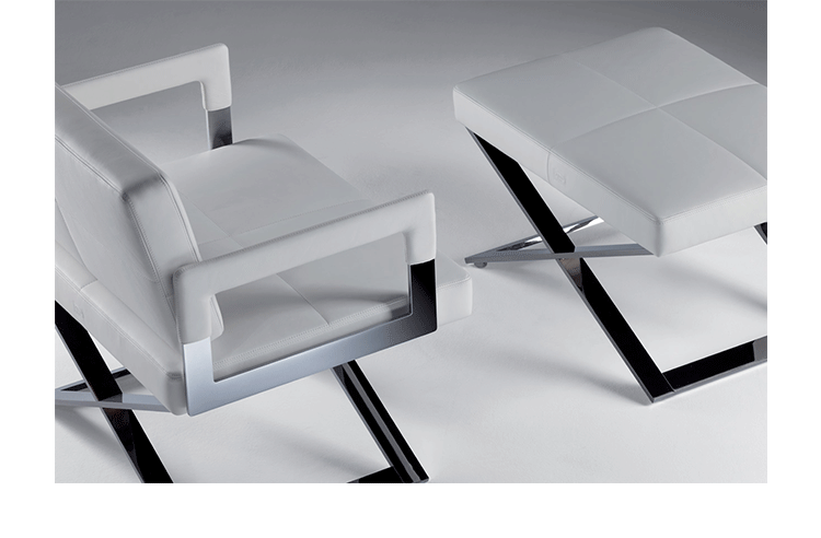 "Leather皮革椅系列家具线条干净简明,“X”交叉造型或者“H”造型脚架支撑着坐垫,新颖独特,由Jean-Marie Massaud设计。它采用外露的金属架,有三种不同的做工,座椅为聚氨酯泡沫材料,靠背较低,坐垫宽敞。有两种面料可供选择:天然皮革和纺织面料。两种款式都有皮革和染色纺织面料的扶手和同款的靠枕。沙发椅的造型形式严谨,它的特点和个性特征与Poltrona Frau现代室内家居的设计非常统一协调。