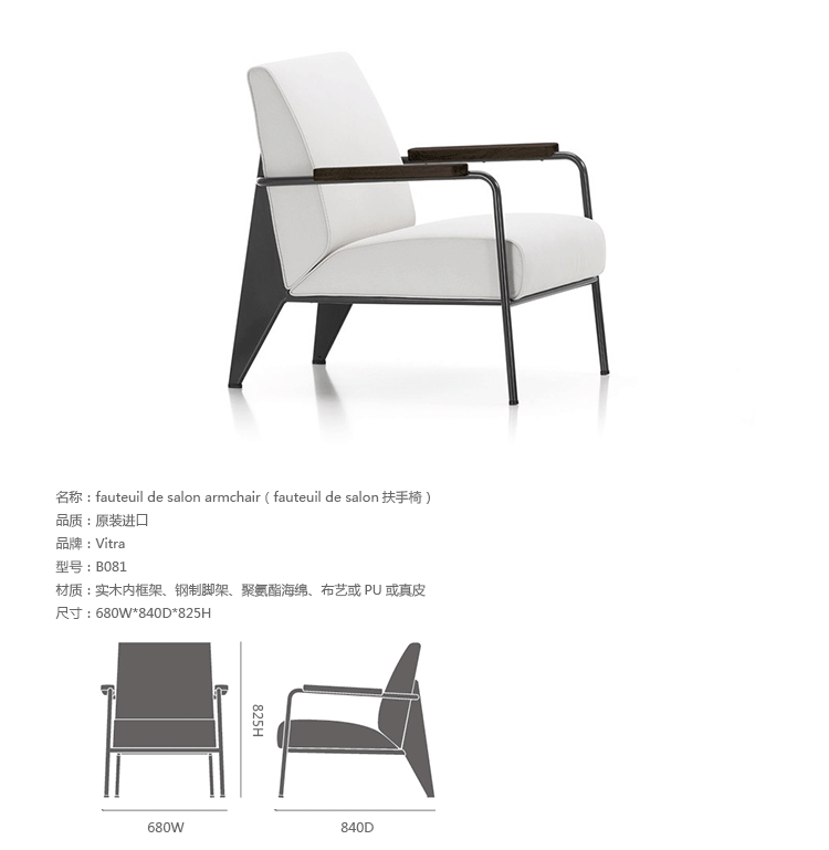 瑞士家具品牌Vitra近日将法国设计师Jean Prouvé的一系列经典作品再次推向了市场--Prouvé系列家具,其中就包括经典的Fauteuil de Salon扶手椅。在原始创作面世的70年后,Vitra重新定义了Jean Prouvé的家具陈列,从高度的调整到电线的整理都进行改造,使之更好的服务于现代办公室及其使用者。Fauteuil de Salon扶手椅由钢铁和实木制成的桌子、椅子和柜子见证了整个工业时代,部分采用绿色工业色调,皮革及织物座套,以及其他细节都颂扬了这些家具的历史起源。该款产皮是设计师里面的典范之作, 简洁的设计风格,毫无过分的修饰,黑白色相间。 运用金属框架显得更加的时尚,而薄片钢的标志性设计彰显了它简洁中又恰到好处的力量感。坐包不是普通的正方形或者长方形,而是带有微小的斜度,让沙发整体看上去更加有活力。无需太奢华的线条,无需多余的色调,低调的奢华,是对Jean prouve这款产品最好的诠释。薄片钢后脚,喷黑灰色粉。前面是钢管喷粉,优雅漂亮的框架。高档超纤皮,柔软、细腻、耐用,做出来的效果更加有型。 如果是配上顶级的青皮,放在简洁的办公区域或者家里,那是一种时尚、高雅、平淡而睿智的恒久画面。高档高弹防火棉,耐用、安全。扶手加固了木护手,黑色木纹。