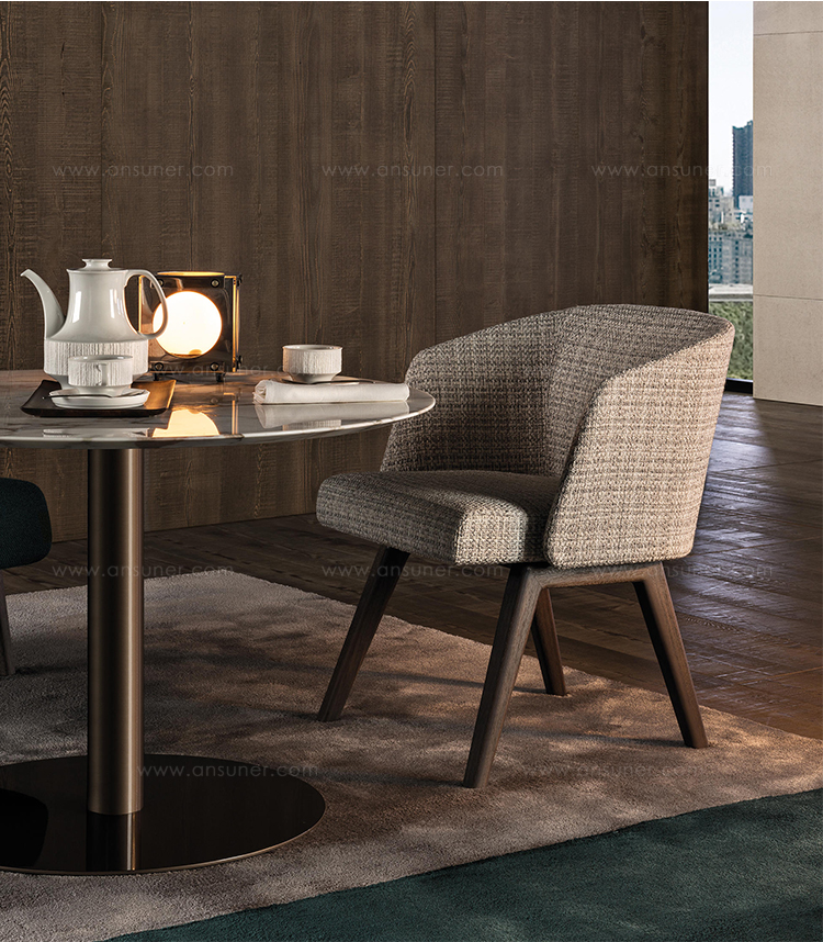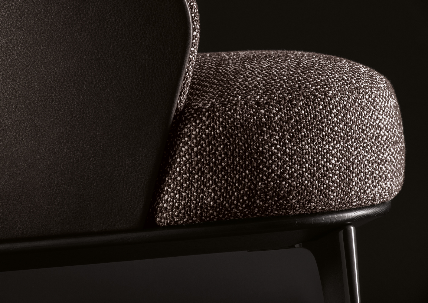 Creed “Lounge”沙发后方的地面支撑采用做工考究的弯曲金属架并搭配浅铜色亮光漆,前方支撑腿则为米灰色的鲍迪豆实木材质。支撑腿的上下方均采用精致的金属部件并搭配浅铜色亮面漆,用与众不同的细节设计来展现非同寻常的高超工艺。