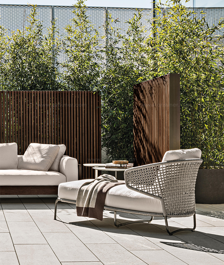 Aston是一个单品家族系列,其中包括沙发、沙发床、扶手椅、脚凳、座椅,为家居环境和“共享空间”提供优雅而时尚的装饰,在室内和室外皆可应对自如。阿斯顿“绳”户外系列采用金属材质的构架,搭配Pewter色聚酯漆面,部件都针对户外环境而经过特别处理,覆面采用疏水性纤维面料。靠背采用直径为7毫米的特殊聚丙烯纱线编织而成,两种颜色可供选择:浅灰色和深棕色,与全新Art Lifescape 02系列的面料和Alison “Dark Brown”户外系列的色调相得益彰。针对户外环境的特点,金属构架经过特别处理,搭配Pewter色聚酯漆面,覆面采用特殊聚丙烯纱线编织而成,有两种颜色可供选择:浅灰色和深棕色。坐垫采用Minotti Studio独家设计并通过激光加工而成的几何装饰。靠垫的内部填充物是高弹性聚氨酯泡沫,覆面采用疏水性纤维面料。