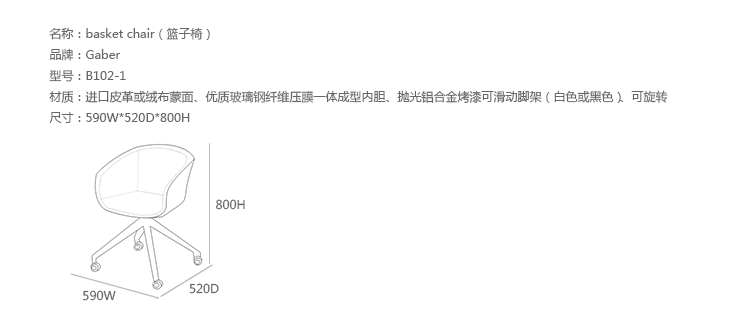 Basket Chair(篮子椅)是Gaber公司最多才多艺的家具系列之一,由意大利设计大师Alessandro Busana设计的。其多种可选颜色、材质、衬垫和框架的选择,是这个系列能够适用多种用途一个特别强有力的特征。篮子椅最重要的是惊人地好看。椅子设计灵感来自传统的柳条家具,具有明显的功能性,能强有力的与周围环境相协调,富有韵律感。椅子具有优雅图形组合的特点,可自由转换。可以选择各式各样的基础脚架,椅子很容易可叠起堆放的,可以在室内或室外使用,可用在休息室也可以用作商业、办公。经典的4腿的金属脚架,可选择6种不同颜色,设置有特殊软垫和防滑可移动垫,塑料和织物塑造了一个有独创性的对比。