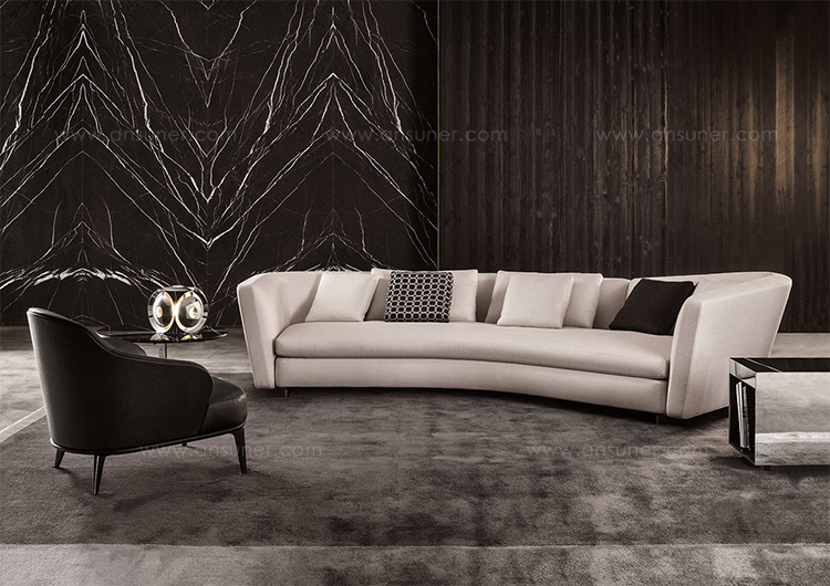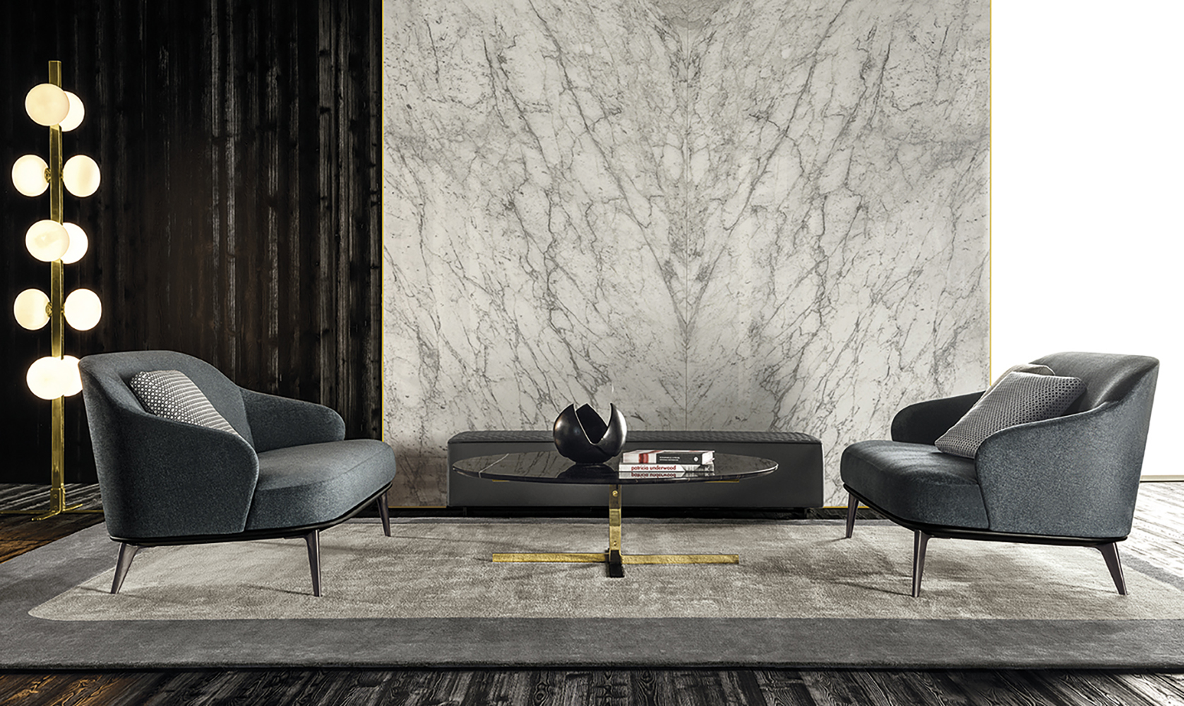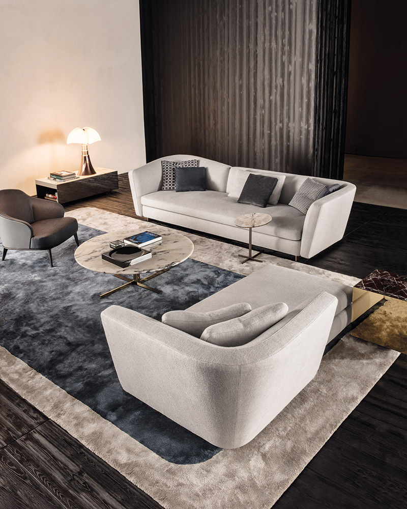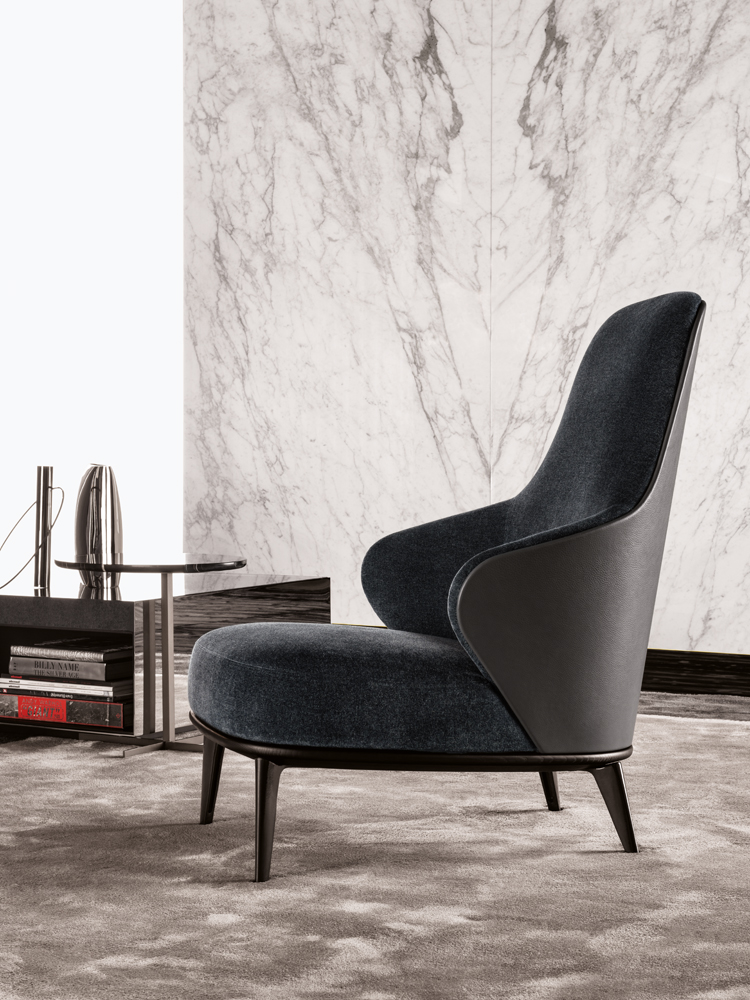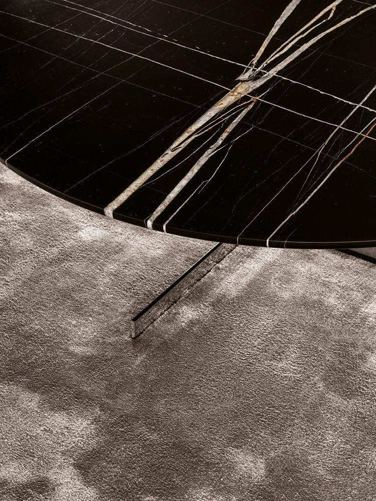 这组边几系列简洁洗练,材质的选择展现出精致的典雅。如果说Catlin边几的设计崇尚简洁,那么材质的选择则旨在打造非凡的视觉和触觉效果。金属基座有着精致的十字形地面支撑腿,其中包括颇有趣味的组合:黑色压花搭配铬色或金色的抛光表面,打造出多种多样的风格。材料的搭配体现出非凡的优雅感,台面可以选择烟灰色的玻璃材质,或是选择两种珍稀名贵的大理石,Arabescato Purple或Sahara Noir,两者都拥有抛光表面。Catlin系列有圆形和椭圆形两种造型,有不同的尺寸可供选择,正如边柜和餐桌一样有多种类型。