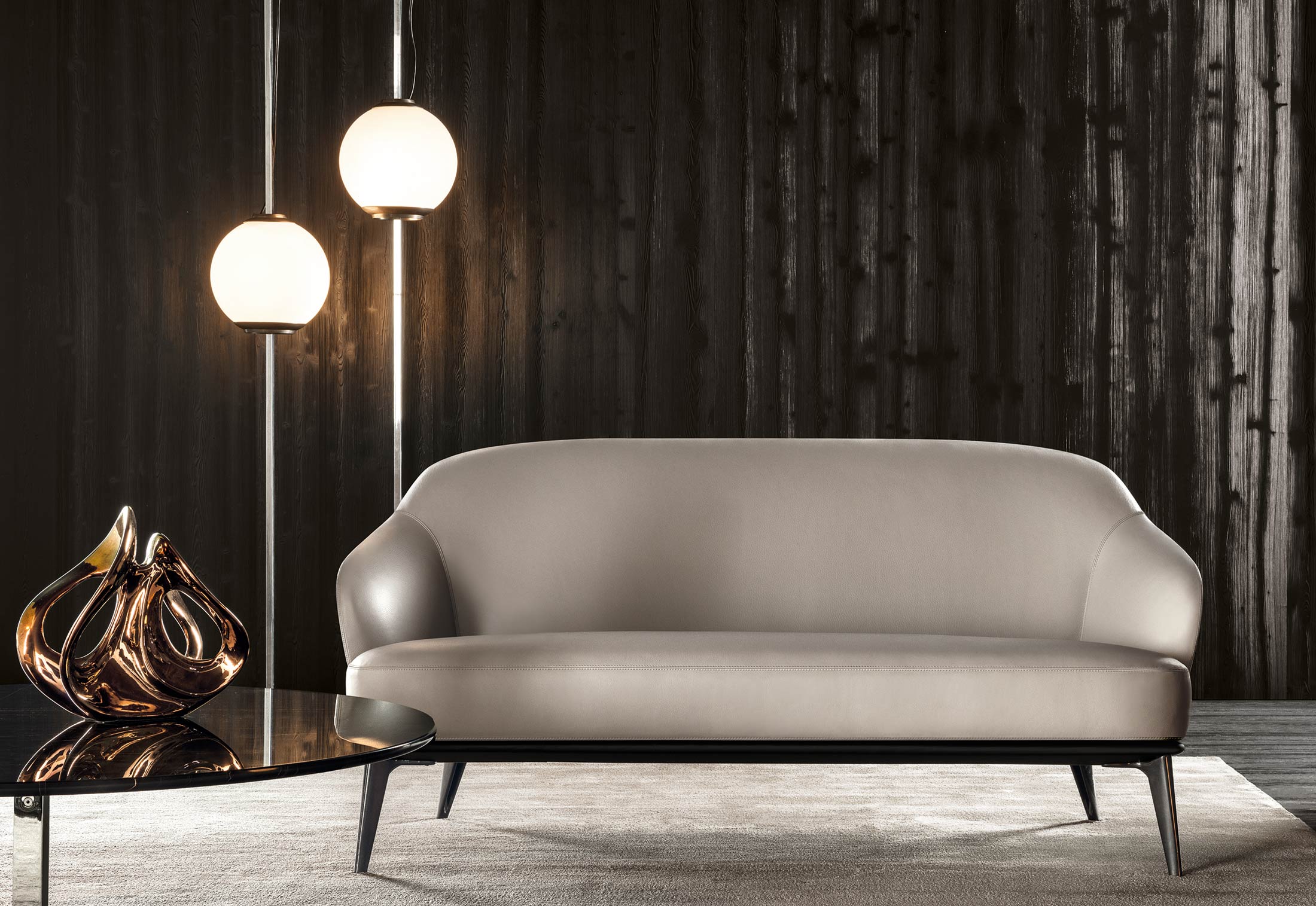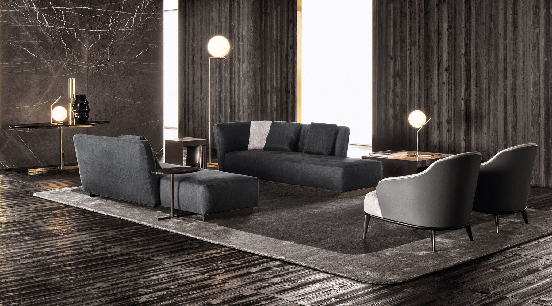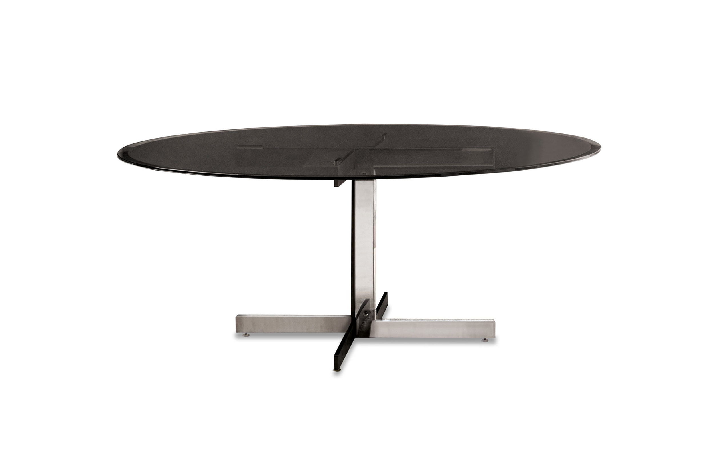 这组边几系列简洁洗练,材质的选择展现出精致的典雅。如果说Catlin边几的设计崇尚简洁,那么材质的选择则旨在打造非凡的视觉和触觉效果。金属基座有着精致的十字形地面支撑腿,其中包括颇有趣味的组合:黑色压花搭配铬色或金色的抛光表面,打造出多种多样的风格。材料的搭配体现出非凡的优雅感,台面可以选择烟灰色的玻璃材质,或是选择两种珍稀名贵的大理石,Arabescato Purple或Sahara Noir,两者都拥有抛光表面。Catlin系列有圆形和椭圆形两种造型,有不同的尺寸可供选择,正如边柜和餐桌一样有多种类型。