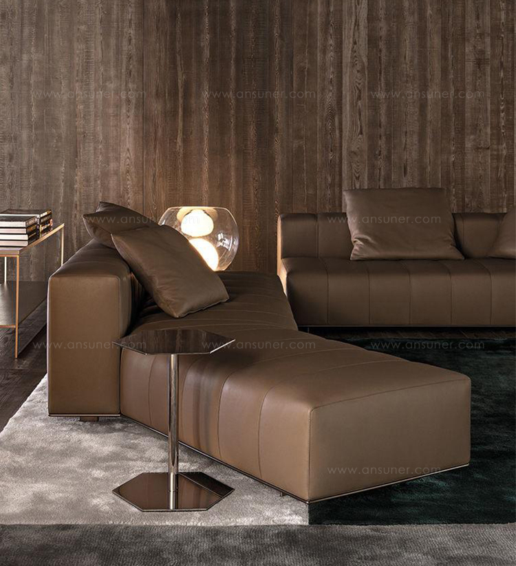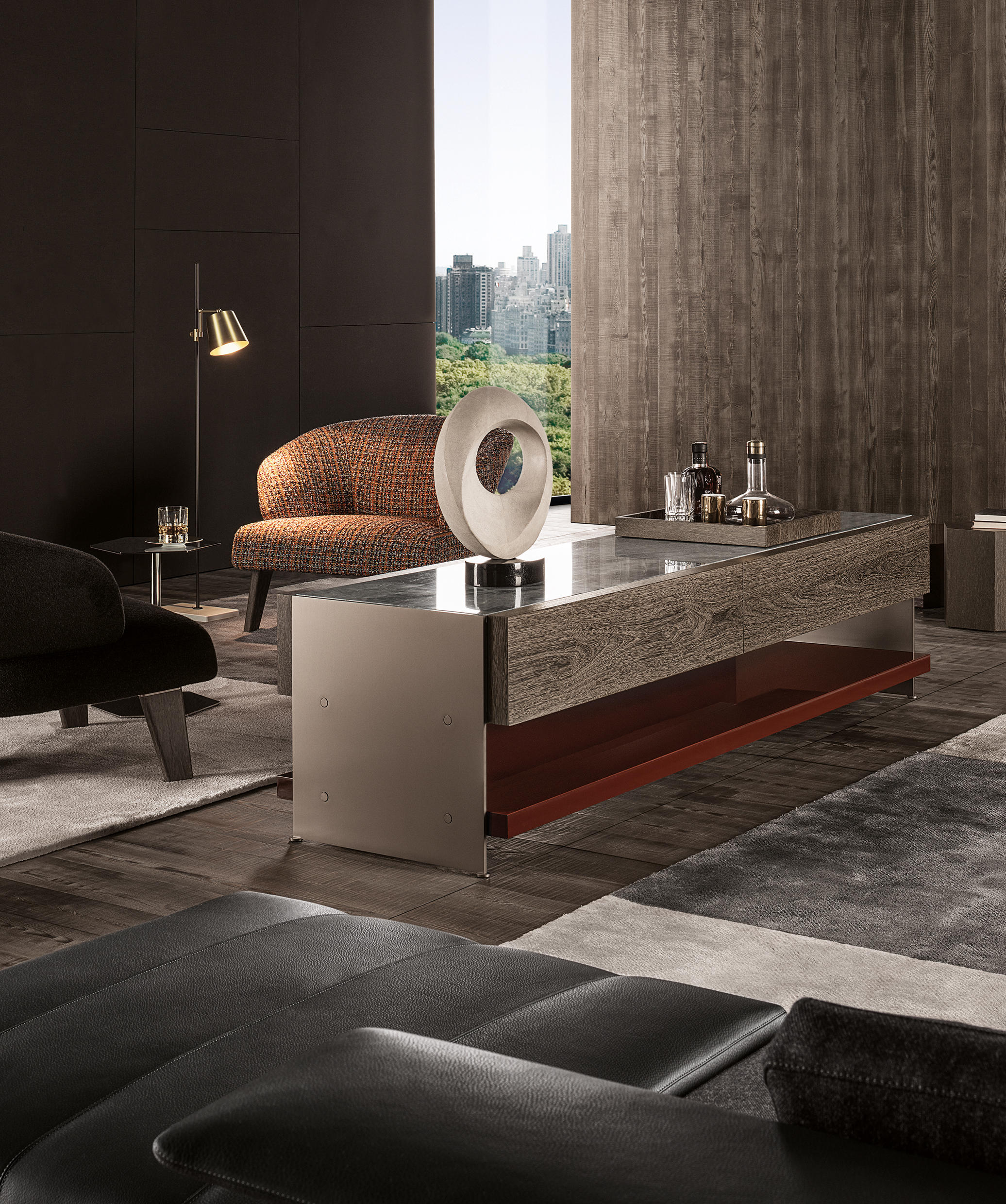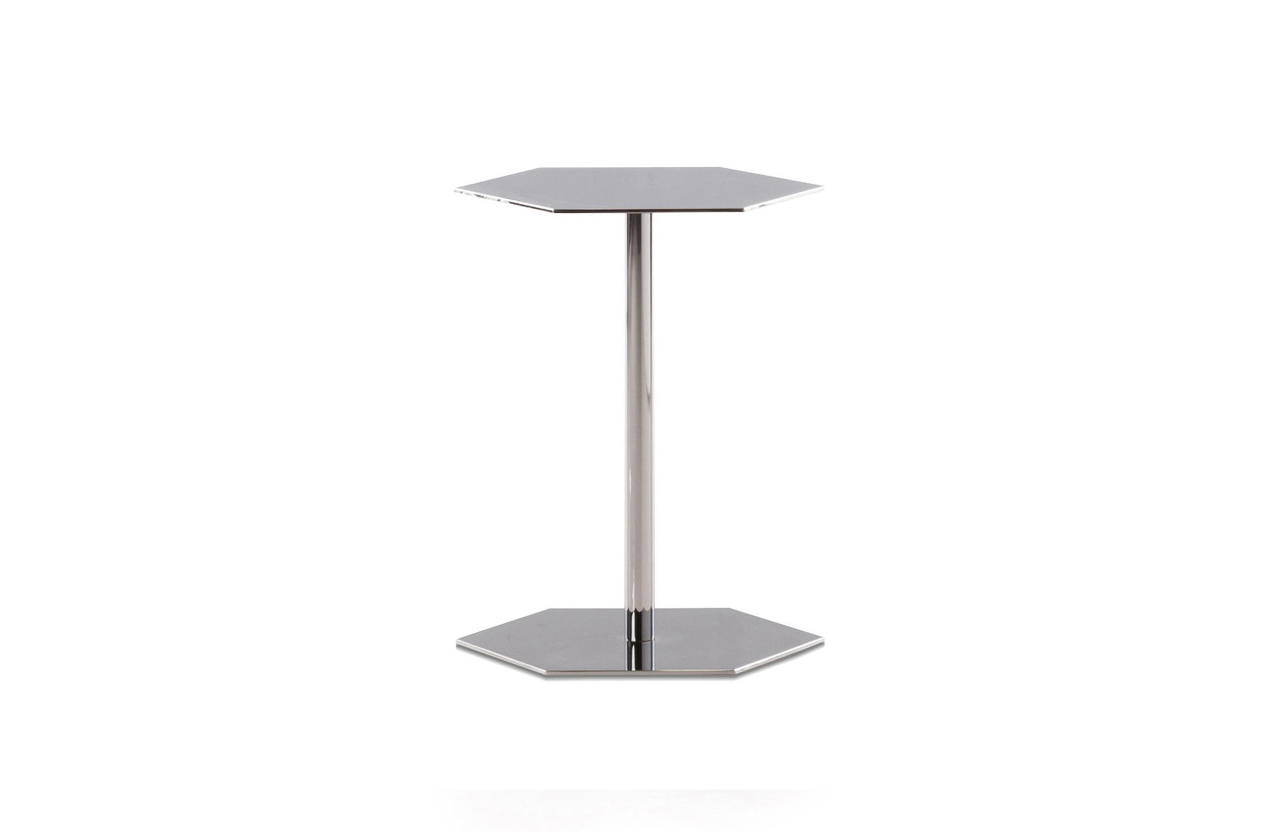 这一系列专为打造居住空间的实用元素而设计,布里斯莱边几具有独特的个性。基座和桌面是完全对称的六边形,这也是2016系列的主旋律之一,镀铬金属材质则突出其利落的个性。布里斯莱推出两个版本:一款是基座和桌面对应的六个角分别用细杆连接,另一款是由中心位置的镀铬金属杆连接基座和桌面。布里斯莱是一款多用途的边几,可以随心所欲地搭配Minotti产品系列中的所有沙发和扶手椅。
