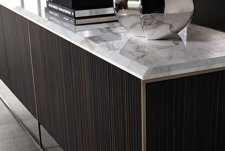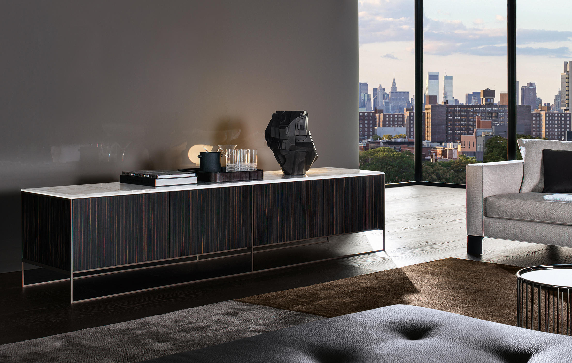 Calder家族有各种尺寸的边几和边桌,这一组全新的设计方案为其带来更为清新时尚的造型。铁架结构如今采用亚光浅铜色的表面。桌面也推出新版本:Sand色亮漆,米灰色的鲍迪豆木饰贴面,Bardiglio Nuvolato和Calacatta的大理石。中间层的桌面也为亚光浅铜漆面的金属。