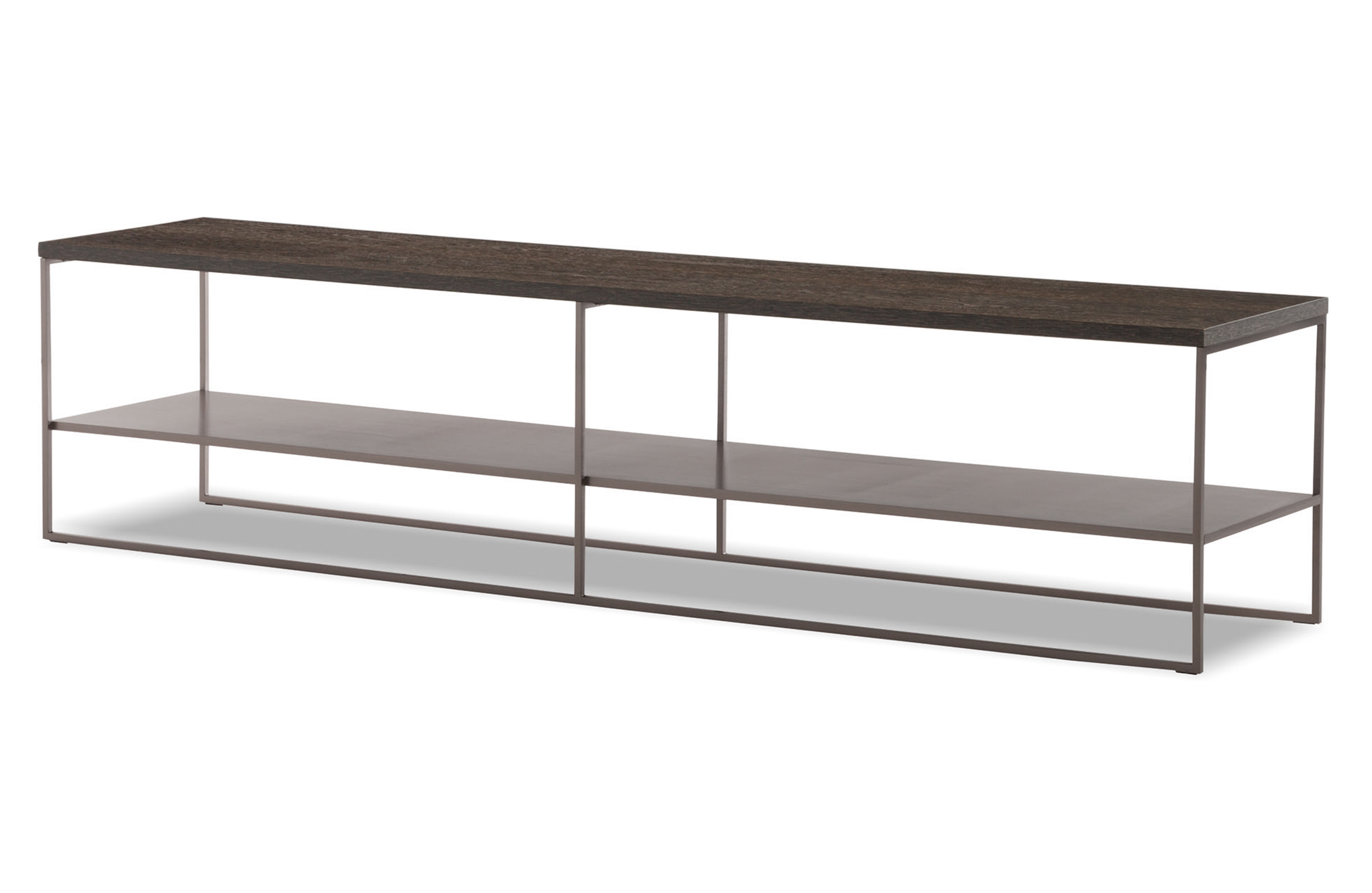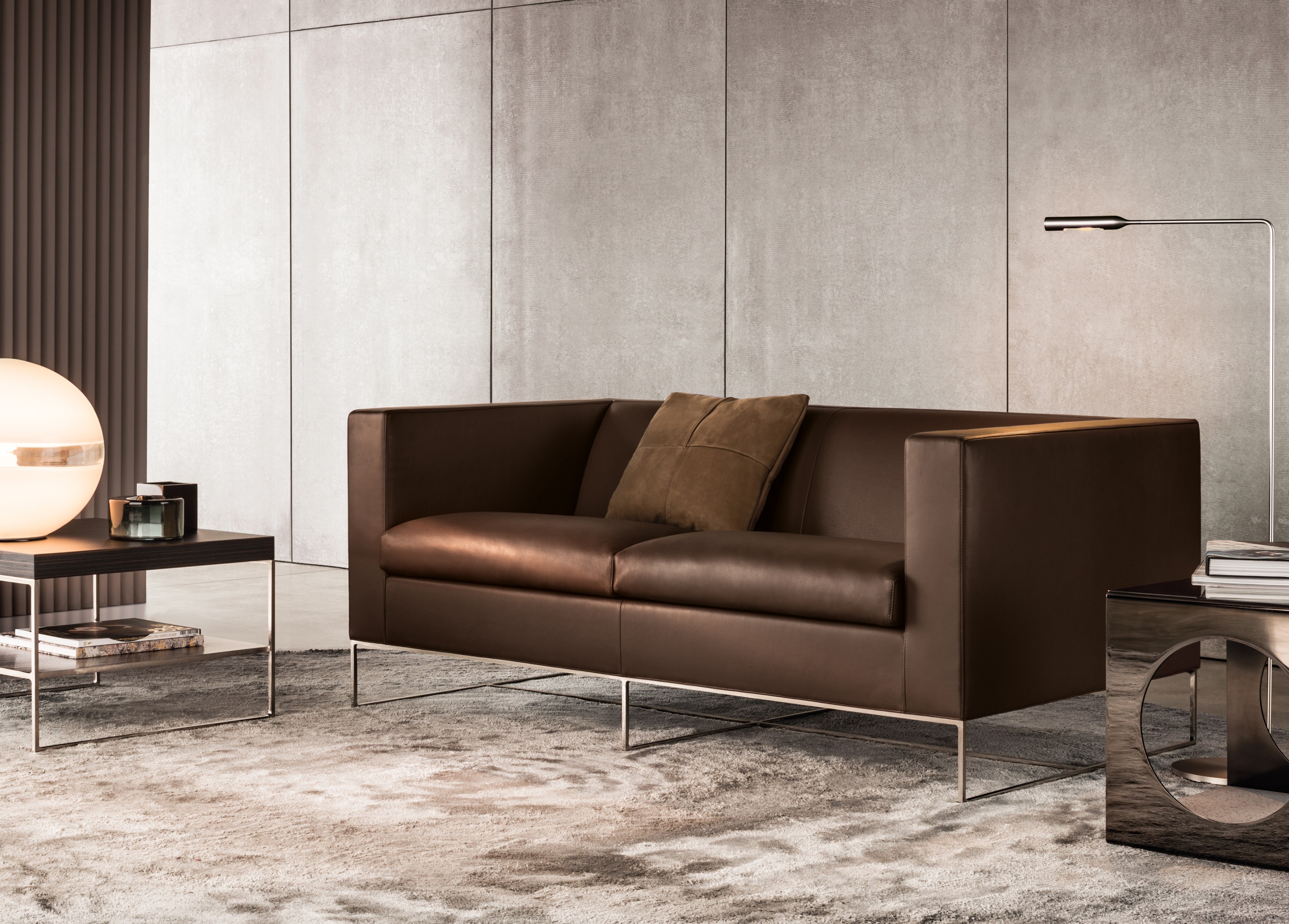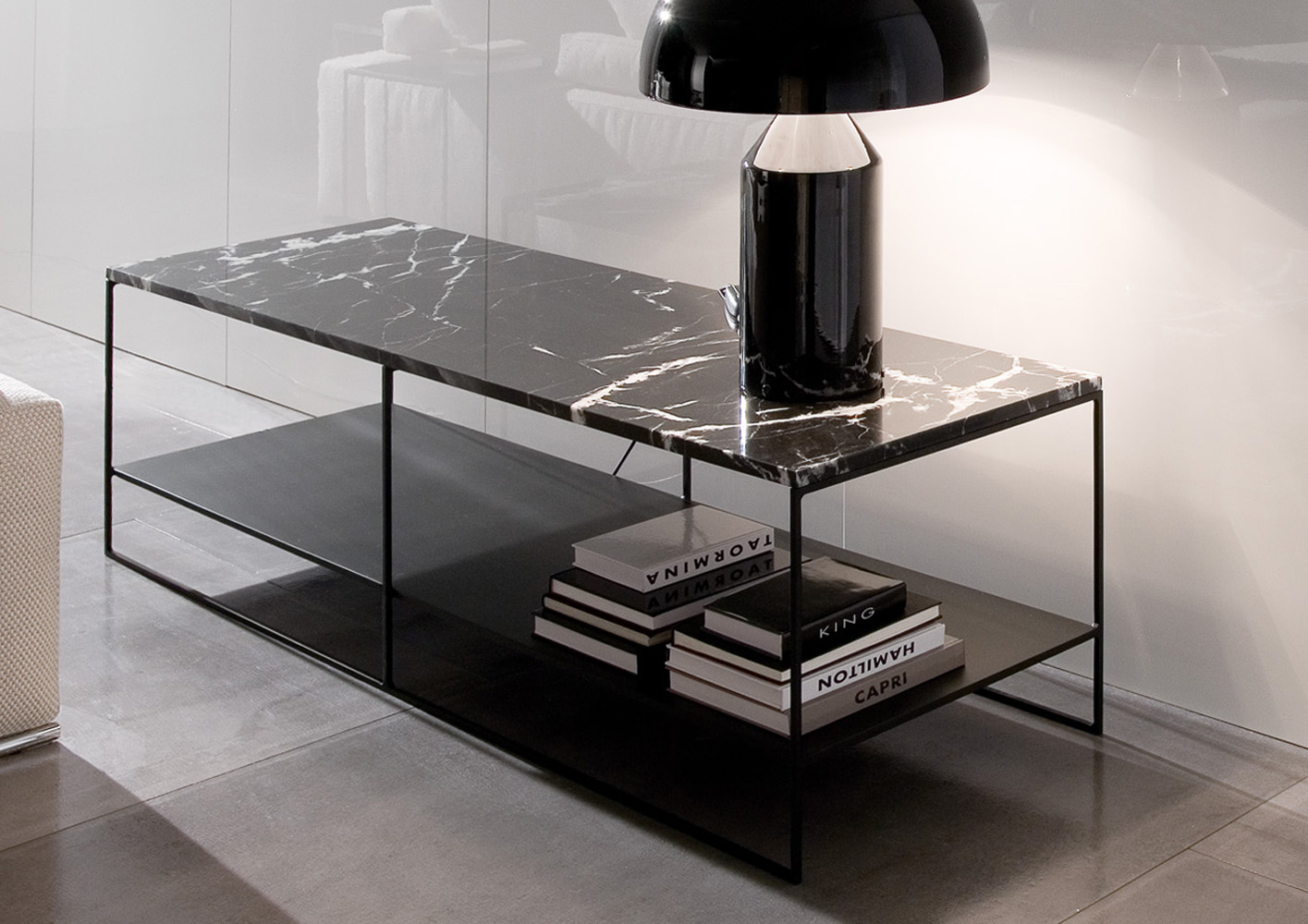 Calder家族有各种尺寸的边几和边桌,这一组全新的设计方案为其带来更为清新时尚的造型。铁架结构如今采用亚光浅铜色的表面。桌面也推出新版本:Sand色亮漆,米灰色的鲍迪豆木饰贴面,Bardiglio Nuvolato和Calacatta的大理石。中间层的桌面也为亚光浅铜漆面的金属。
