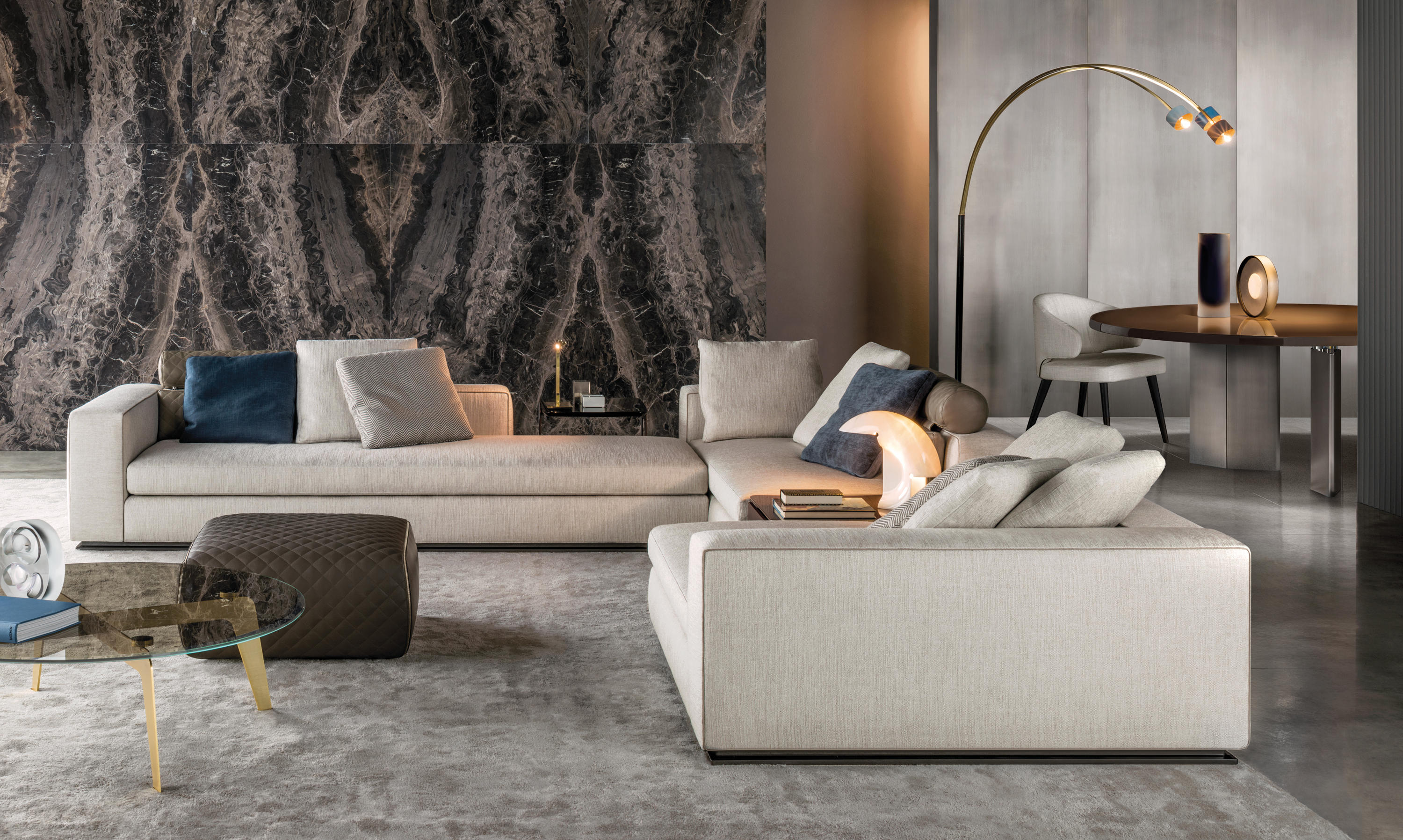 以精美梣木底座致敬传统黑檀木艺术,搭配拥有圆滑转角与柔和饰边的光泽漆面黑檀木、黑色脱蜡琉璃及 Marron Damasco 大理石台板。